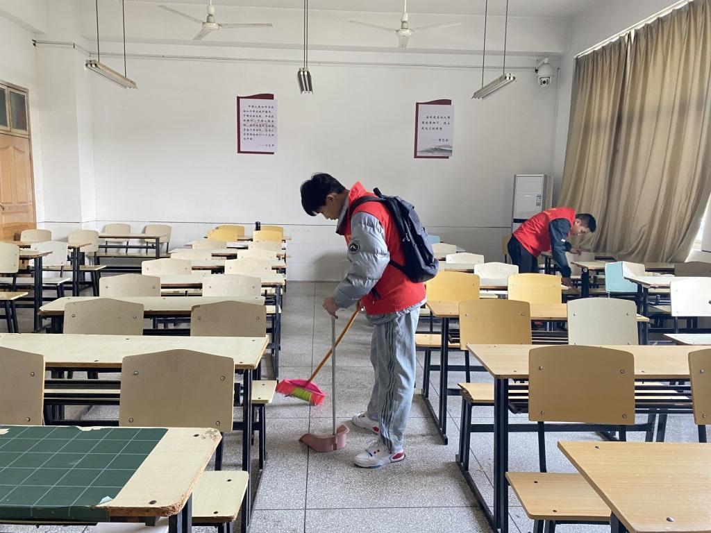 青年志愿者们将文学院主楼教室和楼梯等进行清洁和消毒,为学院师生营造舒心、干净的学习环境,传递文明正能量。