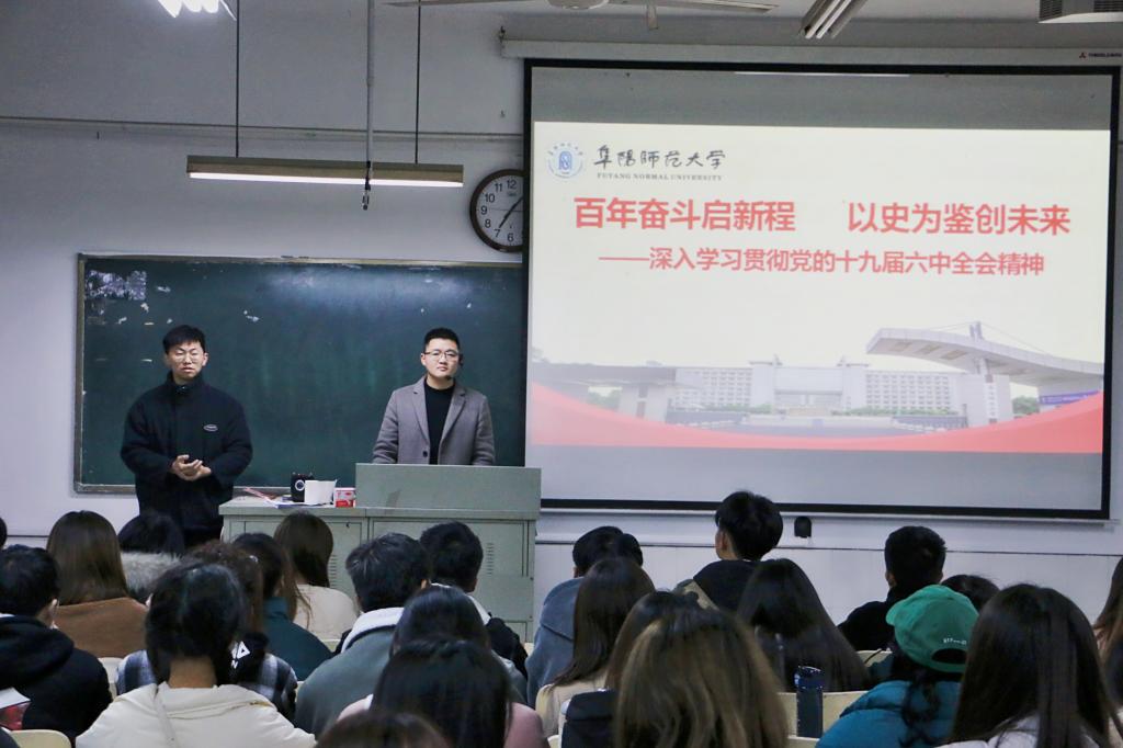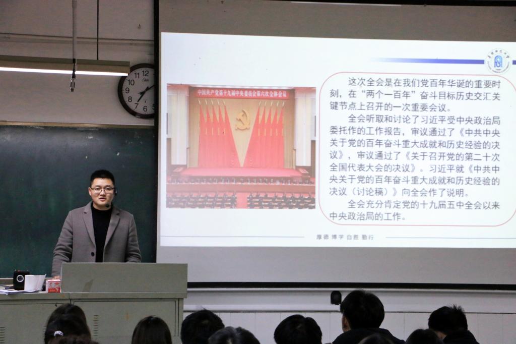 为深入学习贯彻党的十九届六中全会精神,推动全会精神学习宣传贯彻走深走实,12月10日晚,文学院于景行楼201开展十九届六中全会精神专题青年讲师团宣讲活动。校青年讲师团成员、法学院团委负责人李阿康担任主讲。文学院各班学生骨干及组织负责人参加宣讲报告会。