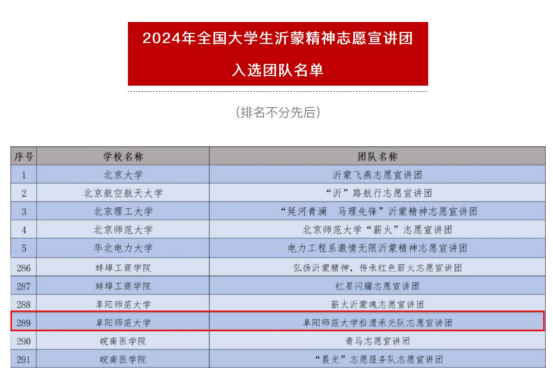 2024年10月上旬,团中央青年志愿者行动指导中心、共青团山东省委、中共临沂市委共同发布了《关于遴选2024年全国大学生沂蒙精神志愿宣讲团的公告》,并于2024年11月6日公布了2024年全国大学生沂蒙精神志愿宣讲团入选名单,文学院组建的拾遗承光队成功入选。