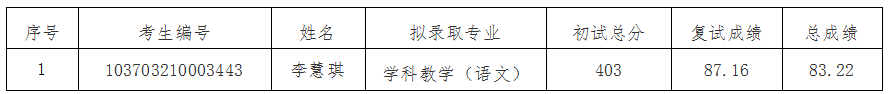 根据教育部《关于印发<2023年全国硕士研究生招生工作管理规定>的通知》(教学〔2022〕3号)、《关于做好2023年全国硕士研究生复试录取工作的通知》(教学司〔2023〕3号)和安徽省高等学校招生委员会 安徽省教育厅《关于做好安徽省2023年硕士研究生复试录取工作的通知》(皖招委〔2023〕4号)等文件精神,按照安徽省2023年硕士研究生招生录取工作会议要求、阜阳师范大学文学院2023年硕士研究生复试录取工作方案。现将我院2023年教育专硕学科教育(语文)专业第二次调剂全日制硕士研究生拟录取名单公示如下: