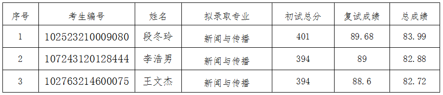 根据教育部《关于印发<2023年全国硕士研究生招生工作管理规定>的通知》(教学〔2022〕3号)、《关于做好2023年全国硕士研究生复试录取工作的通知》(教学司〔2023〕3号)和安徽省高等学校招生委员会 安徽省教育厅《关于做好安徽省2023年硕士研究生复试录取工作的通知》(皖招委〔2023〕4号)等文件精神以及相关会议要求、阜阳师范大学文学院2023年硕士研究生复试录取工作方案。现将我院2023年新闻与传播第一次调剂全日制硕士研究生拟录取名单公示如下: