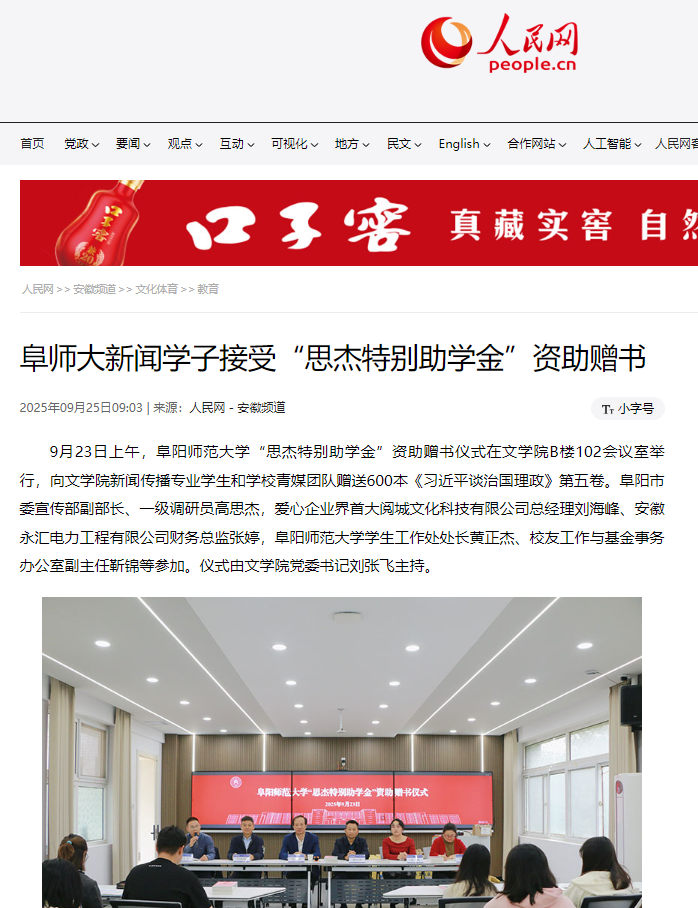 9月25日,人民网报道:阜师大新闻学子接受“思杰特别助学金”资助赠书。链接地址:http://ah.people.com.cn/n2/2025/0925/c358324-41363384.html。