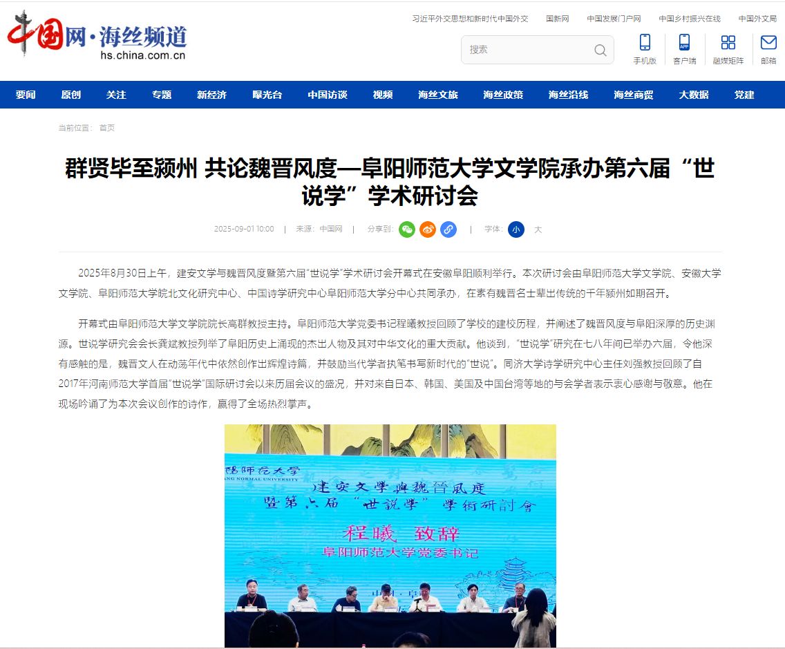 9月1日,中国网报道:群贤毕至颍州 共论魏晋风度—阜阳师范大学文学院承办第六届“世说学”学术研讨会。文章地址:http://hs.china.com.cn/2025-09/01/content_43217165.html