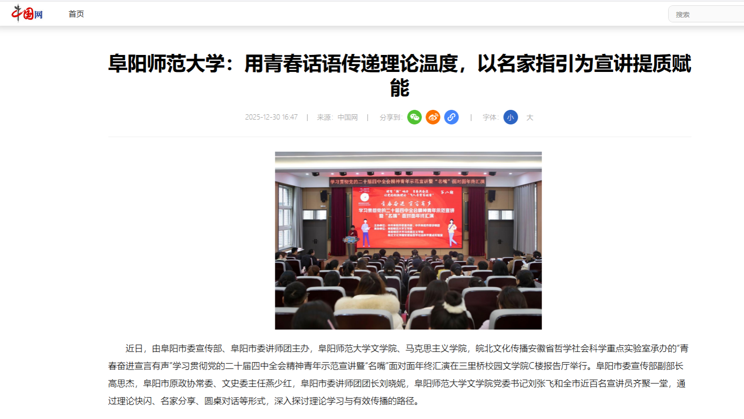 12月30日,中国网报道:阜阳师范大学:用青春话语传递理论温度,以名家指引为宣讲提质赋能。链接地址:http://yingji.china.com.cn/2025-12/30/content_43323933.shtml