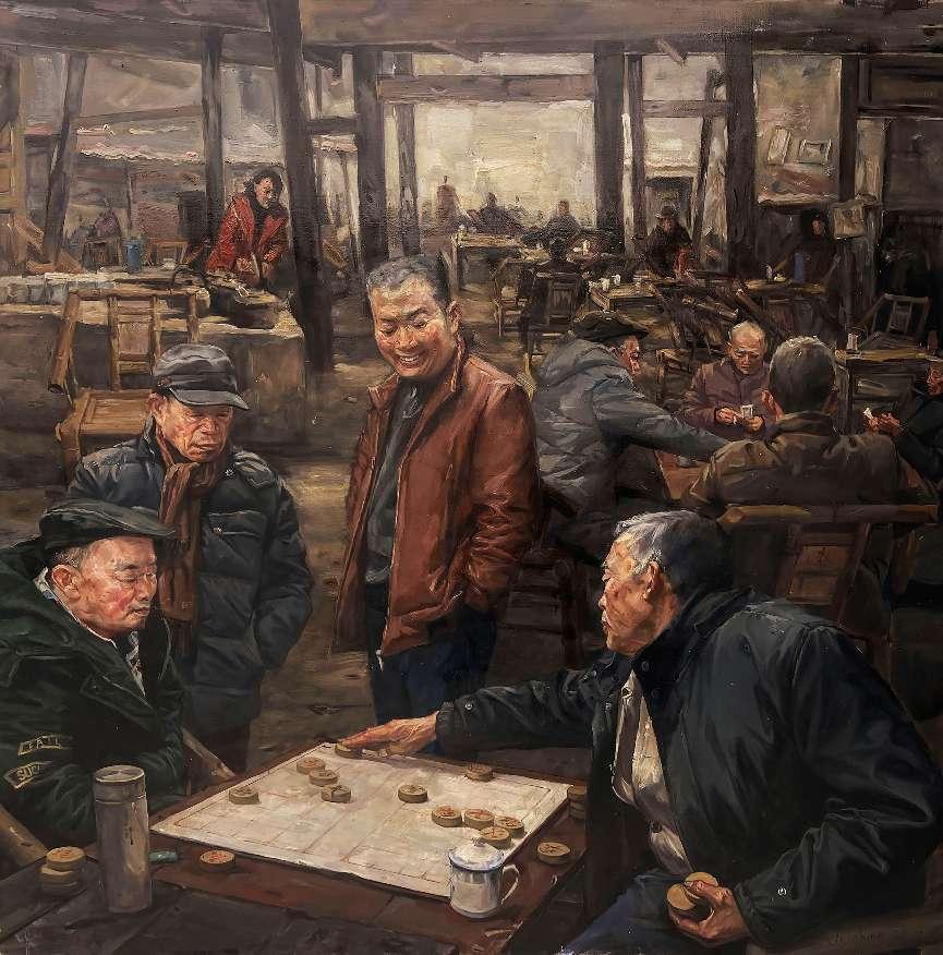 油画作品《茶语叙事·弈趣》,以现实主义手法进行艺术表现,坚持以人民为中心、讲好中国故事的创作导向,聚焦在茶馆里面喝茶、聊天、下棋、唱戏的人群,再现他们的幸福生活。作品也以茶馆中具有寻常烟火气息的视角,再现百姓对新时代中国特色社会主义的制度自信和文化自信。通过生活中的细节描绘,体现了作者对国家、社会和人生现实的情感关照,对生活本身和社会最广泛问题的关注和表现。