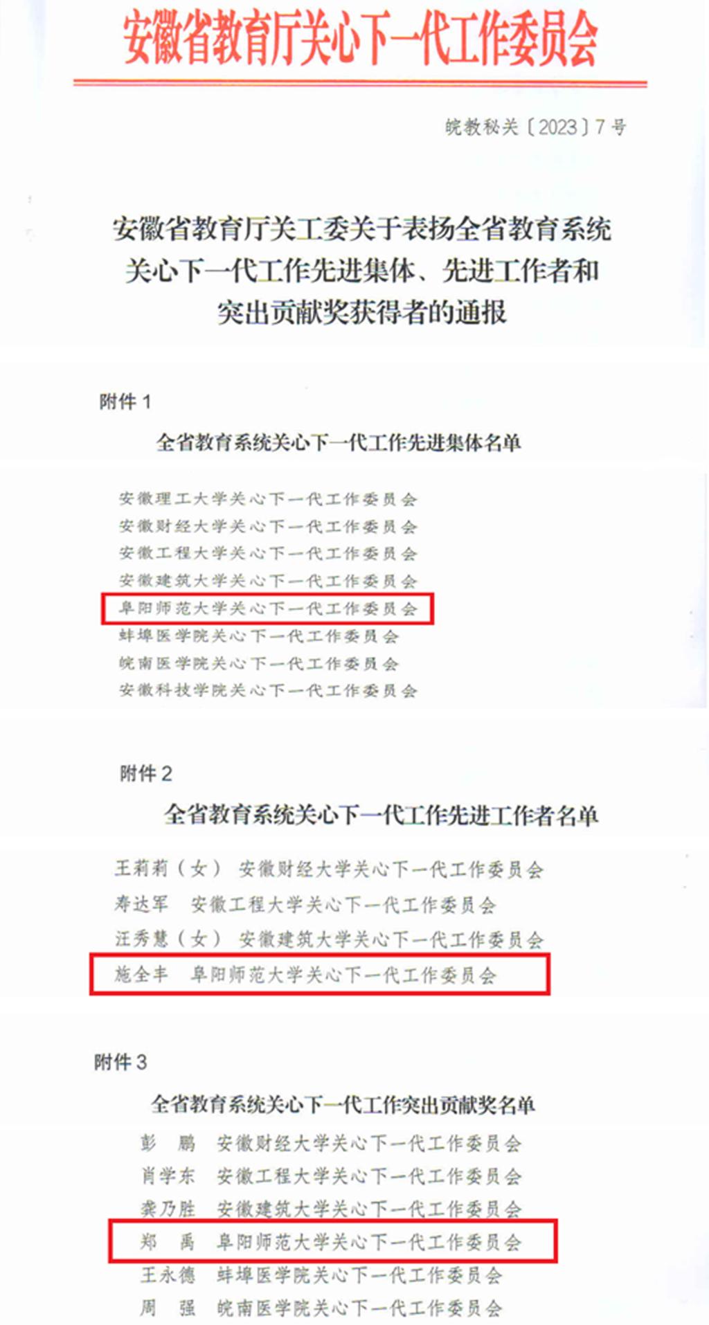 学校关工委以立德树人为根本任务,加强青少年理想信念教育和思想道德建设,促进青少年健康成长,因取得显著成效荣获“全省教育系统关心下一代工作先进集体”荣誉称号,校关工委常务副主任郑禹获“全省教育系统关心下一代工作突出贡献奖”荣誉称号,校关工委委员施全丰获“全省教育系统关心下一代工作先进工作者”荣誉称号;档案馆被评为工作成绩突出单位;信息化中心被评为安徽省高效信息化建设年度考核优秀单位,唐攀锋被评为先进个人;国有资产管理处荣获2022年度全省高效采购业务技能大练兵本科高效组集体二等奖和优秀组织奖,芦广银获个人一等奖,周自勇、高道斌获个人三等奖。这些都是学校全体教职工保持状态、永不掉队,在“千帆竞发、百舸争流”中奋勇争先,在“勇攀高峰、挑战极限”中全力冲刺,为学校教育事业不断争取佳绩,造就辉煌。