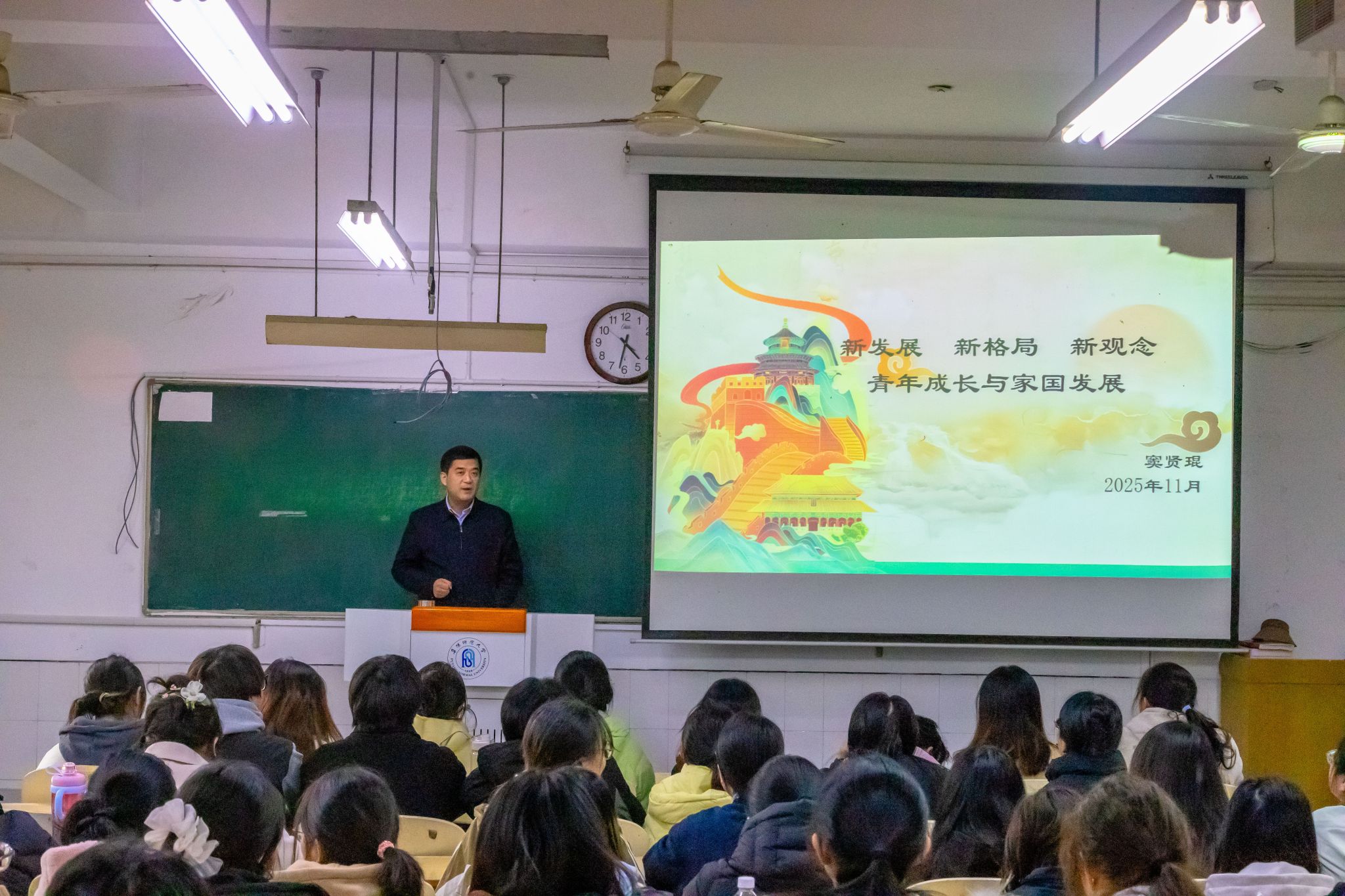 为深入学习贯彻落实习近平总书记对学校思政课建设的重要指示精神,全面落实立德树人根本任务,推进党的创新理论最新成果进教材、进课堂、进头脑,11月19日下午,校党委常委、副校长窦贤琨走进我校西湖校区景行楼211教室,为文学院2024级网络与新媒体1班、2024级新闻学1班的同学们作题为《新发展新格局新观念青年成长与家国发展》的专题授课。马克思主义学院有关负责人及教师代表参加活动。