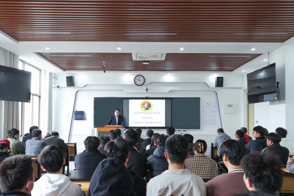 随后,胡春泉前往体育学院实地考察,为武术与民族传统体育专业师生做了题为《武术魂即民族魂中华魂》的学术报告。