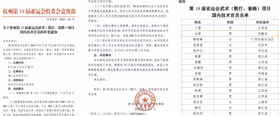 为做好杭州第十九届亚运会竞赛组织工作,9月,杭州第十九届亚运会组委会竞赛部发来的“技术官员邀请函”,我校教师汝雷受邀在9月23日至9月28日,担任杭州第十九届亚运会武术套路竞赛国内技术官员(NTO)工作。