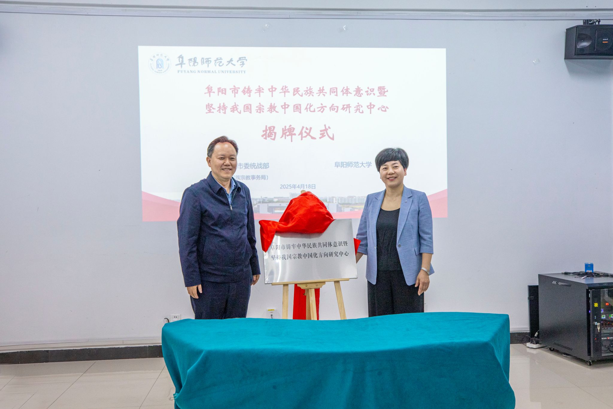 4月18日上午,阜阳市铸牢中华民族共同体意识暨坚持我国宗教中国化方向研究中心在我校揭牌成立。阜阳市委常委、统战部部长张俊杰,校党委副书记、校长方廷勇,阜阳市委统战部常务副部长、市委台湾工作办公室(市政府台湾事务办公室)主任、市政府侨务办公室主任王显明,阜阳市委统战部副部长、民族宗教事务局局长刘伟出席揭牌仪式。阜阳市委统战部及我校党委统战部、科研处、马克思主义学院等单位有关负责人、师生代表参加仪式。