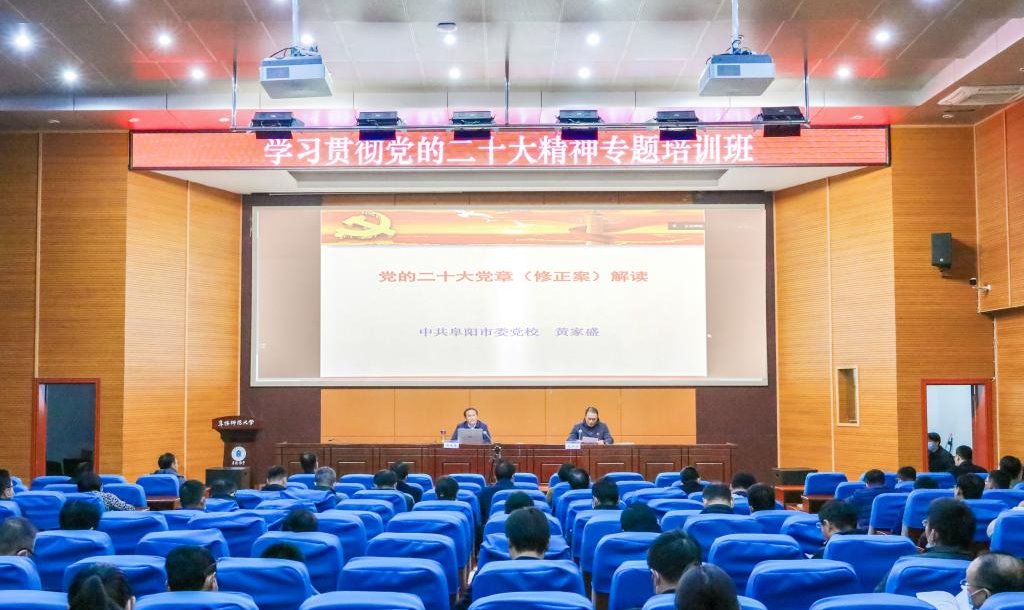为深入学习贯彻党的二十大精神,切实把思想和行动统一到党的二十大精神上来,11月18日下午,学校举办学习贯彻党的二十大精神专题培训班,邀请阜阳市委党校校务委员、正处级副校长、市社会主义学院副院长,阜阳市政协常委黄家盛作《党的二十大党章(修正案)解读》专题辅导报告。报告会由校党委常委、党委组织部部长包春雷主持。