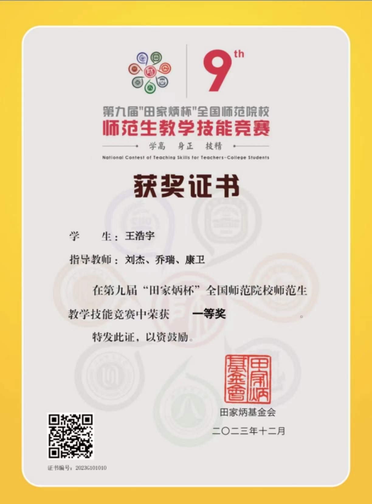 2023年12月29日至31日,第九届“田家炳杯”全国师范院校师范生教学技能竞赛决赛在浙江师范大学举行,王浩宇获高中语文组一等奖。“田家炳杯”全国师范院校师范生教学技能竞赛是目前国内师范生教学技能比赛中层次最高、规模最大、影响最广的全国性赛事之一。王浩宇勤学求真,脚踏实地,拥有出色的教学能力,有意识地将课堂上学习到的知识运用到日常的教学中,成为此次比赛安徽省同科目的学生中,唯一进入决赛且取得一等奖的选手。