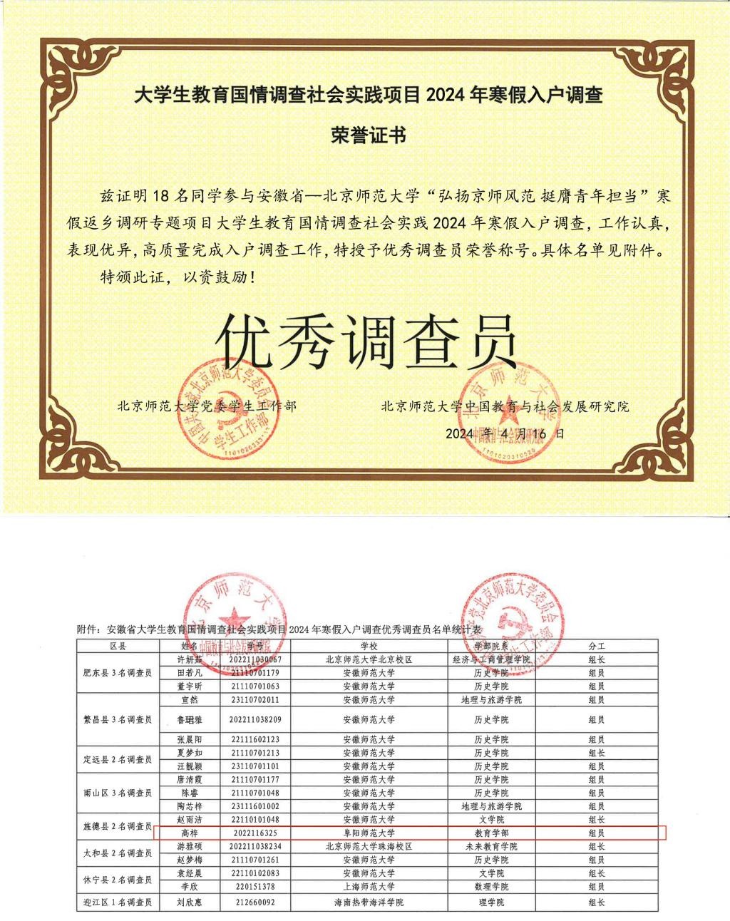 在寒假中,高梓还参加“弘扬京师风范 挺膺青年担当”寒假返乡调研专题项目大学生教育国情调查社会实践2024寒假入户调查的实践工作。谈到调研的过程,她描述道:“我所在的市区不属于调研的区域,所以我需要坐城际公交往返县城去做调研,因为需要入户,且访谈时间较长,在前期寻找样本和中期访谈也遇到了很多人不配合的情况。每份问卷有效时长至少四十分钟,所有问卷全部转录成文本超过了十万字,入户、访谈、上传、转录、整理,任务量还是很大的。”面对这么大的工作量,她也曾想过放弃,”但是我当时听到了一句话,‘对答世界的音量,有我一份渺小的力量’。这句话在当时激励了我,因为我觉得能为教育国情研究提供一点小小的数据参考,已经是一件很有价值的事情了。“最终,她因为表现优异,且高质、高效完成了入户调查工作,被授予优秀调查员的荣誉称号。
