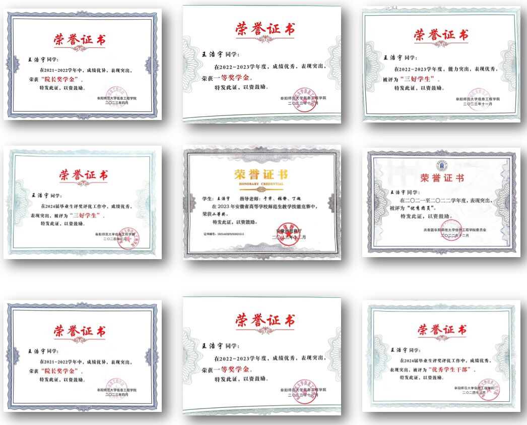 踏实负责,善始善终。作为班长,王浩宇策划并成功组织多次班级团建活动,所在的班级凝聚力强,整体学习氛围良好,多次荣获“十佳文明班级”。王浩宇的学习成绩优异,同时肩负引领班级学风的责任。他积极向同学们分享课堂笔记和学习心得,在学期末主动帮助学习有困难的同学查缺补漏。在他的不懈努力下,班级的平均成绩逐年上升。除此之外,王浩宇还协助辅导员和团支书开展团学工作,努力提升团员的活动参与度和身份荣誉感,推动团员参与志愿服务和社会实践。班级多次荣获“优秀团支部”,其个人也多次荣获校级“优秀团干部”称号。