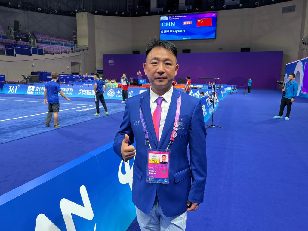 汝雷在北京体育大学就读本科期间,就已经取得了武术套路一级裁判员资格,2012年在我校工作期间被国家体育总局武术运动管理中心授予武术套路国家级裁判员资格。历年来执裁过第九届世界传统武术锦标赛、第十四届全国运动会太极拳决赛、全国武术套路锦标赛等,并在2023年安徽省青少年武术套路锦标赛中担任总裁判长,为武术套路竞赛工作的开展做出了积极贡献。在第十九届杭州亚运会中,他受邀担任亚运会武术套路竞赛国内技术官员。作为亚洲最高规格的国际综合性体育赛事,亚组委要求国内技术官员不仅要有精湛的业务能力、过硬的技术水平,更要有全国大型赛事的执裁经历。在亚运会武术比赛中,他作为武术套路比赛的国内技术官员,在保障武术比赛公平公正的同时,也为亚运盛会贡献了阜阳师范大学的武术力量,在亚运赛场上看到中国运动员获得金牌,每当五星红旗升起、国歌奏响时他心情无比激动,为中国运动健儿感到骄傲和自豪。谈到作为裁判员的心得,汝雷说:“裁判工作需要坚持不懈的学习,不断汲取新的专业知识,深入了解武术比赛的新规则和判罚标准,以确保公正准确执裁”。