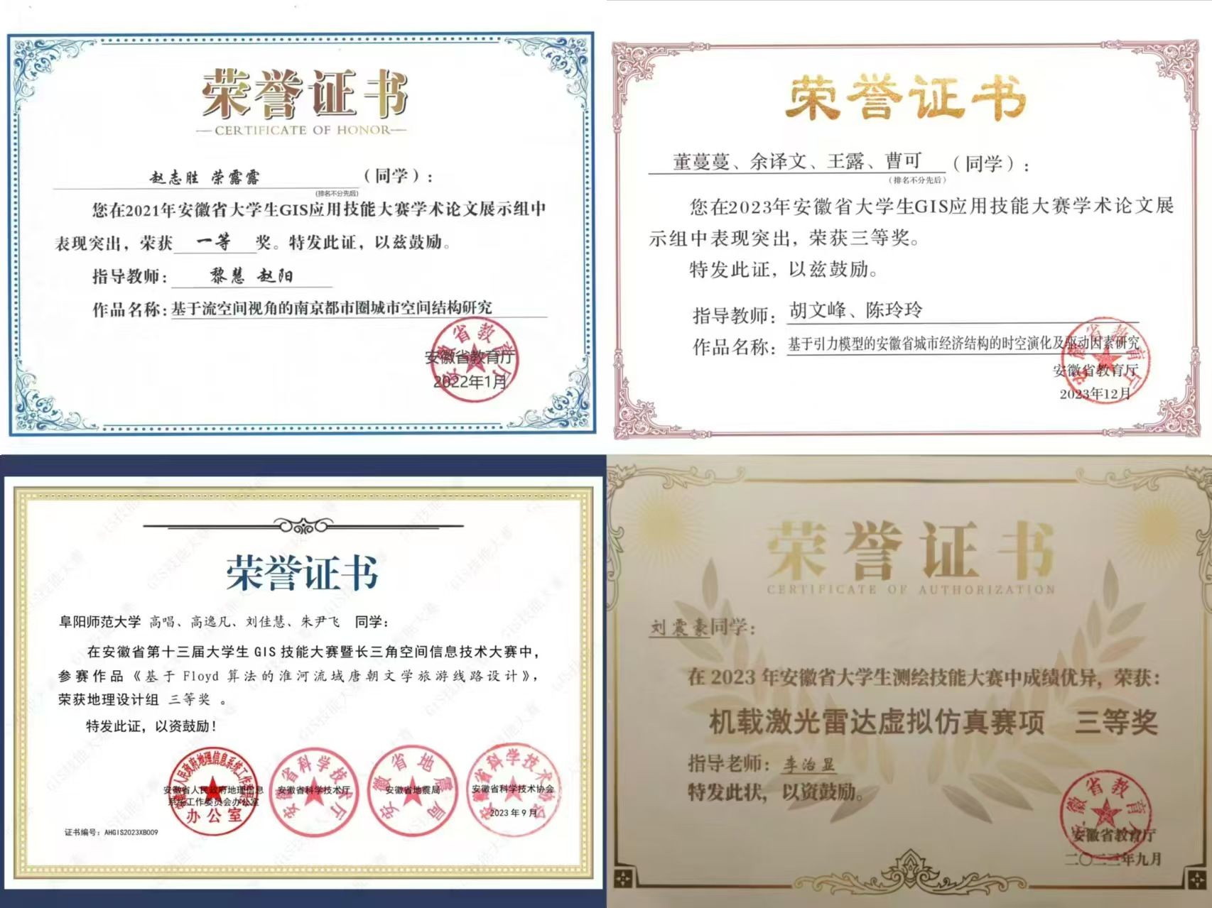 学院始终坚持重视科研项目,近四年连续获批多项荣誉,其中获批国家社科基金重大项目1项,实现了我校在该级别项目的历史性突破;荣获安徽省社会科学优秀成果奖二、三等奖各1项。学院学生多人在全国高等师范院校历史学专业教学技能大赛,长三角师范生技能大赛、各级“挑战杯”比赛、安徽省师范生教学技能大赛、“超图杯”安徽省大学生GIS技能大赛、 安徽省大学生“茶文化创新大赛”、“全国大学生城市管理竞赛”等比赛中获奖。
