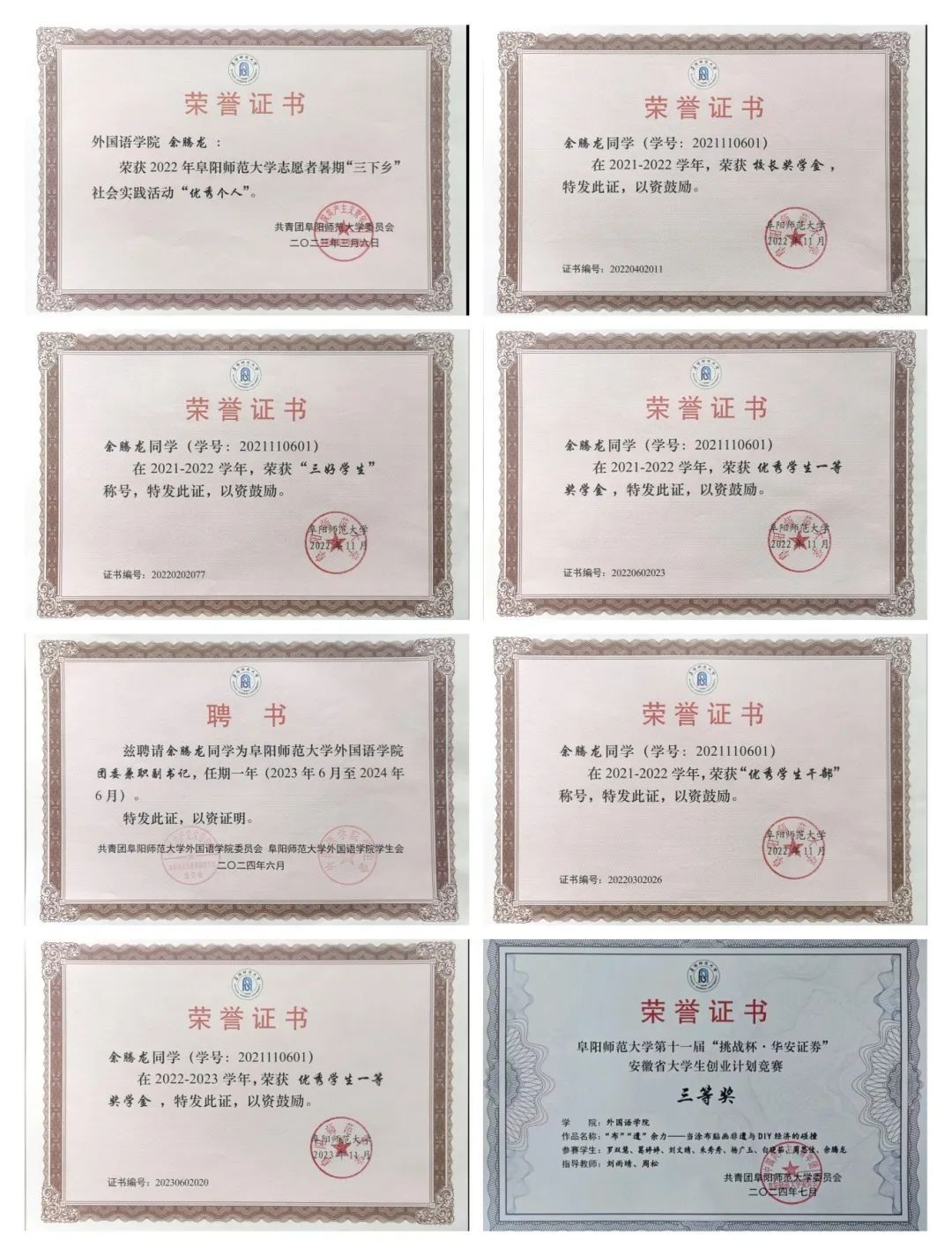 在校期间,曾担任班长、文学院学生会网络宣传部部门负责人;获国家励志奖学金3次、校长奖学金1次、优秀学生一等奖学金3次;连续获得 “三好学生”“优秀学生干部”“优秀团干部”“优秀团员”等荣誉称号;在2021年新生军训工作中获“优秀学员”称号。