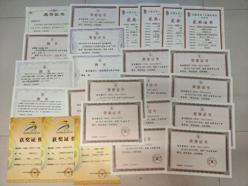 在校期间,曾担任思政委员、2023级新生辅导员助理;获国家励志奖学金、校长奖学金、自胜奖学金、优秀学生一等奖学金和二等奖学金等;获“三好学生标兵”“三好学生”“优秀团员”等荣誉称号;在第十三届“正大杯”全国大学生市场调查与分析大赛中获国家三等奖,在第十四届全国大学生三创赛中获省级二等奖,在数学建模比赛中获安徽省二等奖,在国元证券杯比赛中获安徽省二等奖。