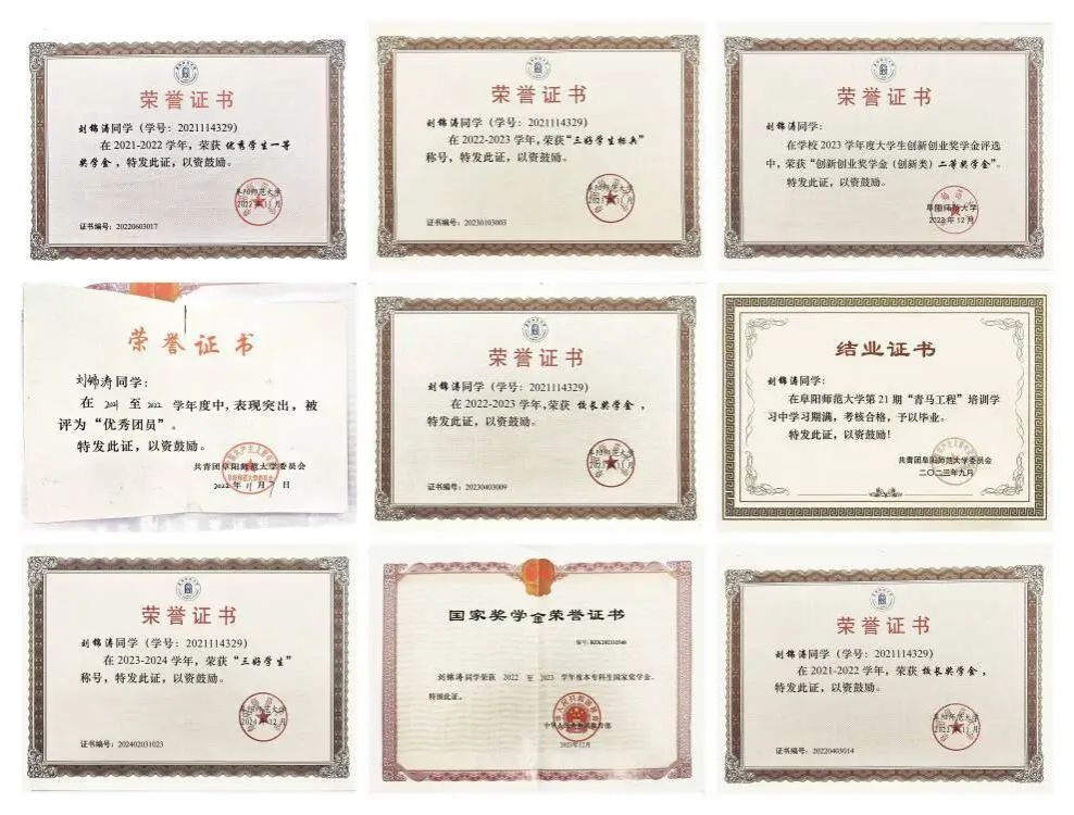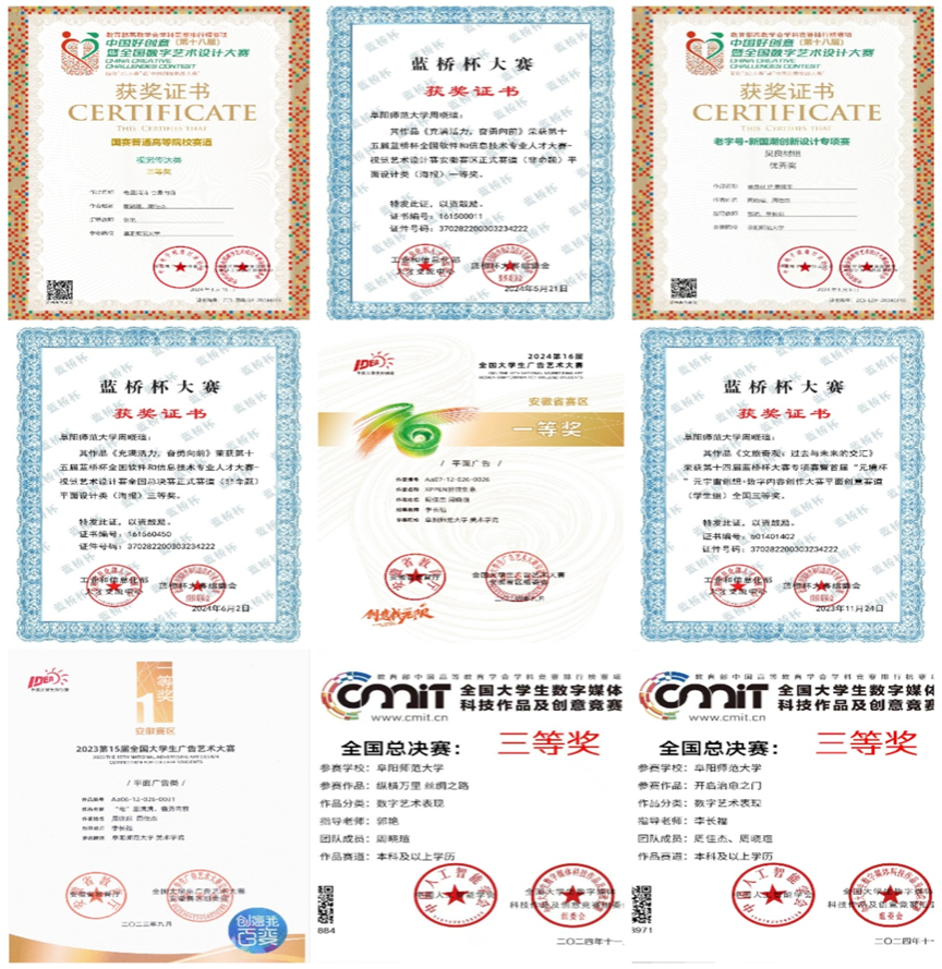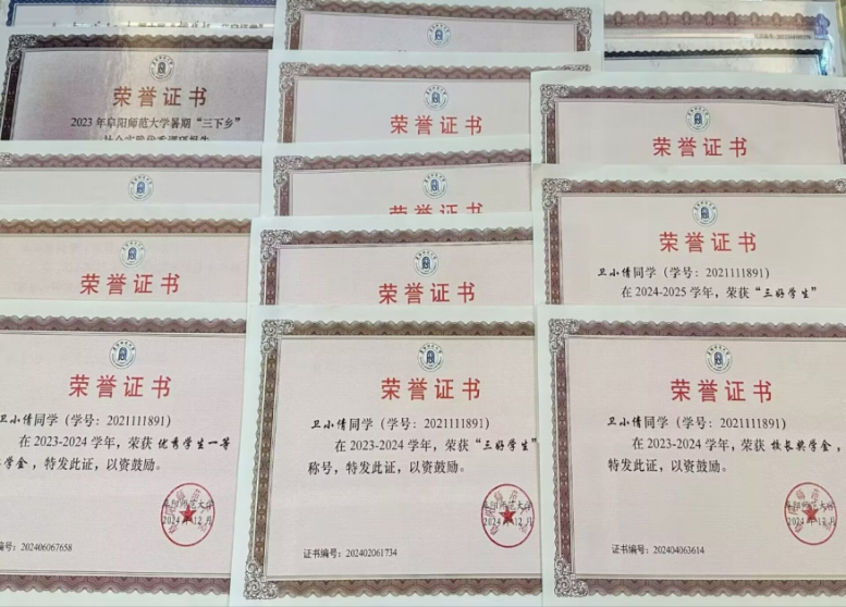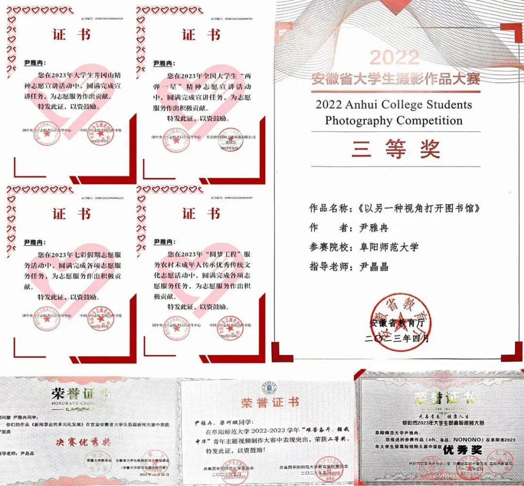 在校期间,曾担任班级团支书、美术学院心理委员联合会执行主席、2023级新生辅导员助理;获国家奖学金、国家励志奖学金、校长奖学金、优秀学生一等奖学金等;获“三好学生”“三好学生标兵”“优秀团干部”“阜阳师范大学十佳先进个人”等荣誉称号。
