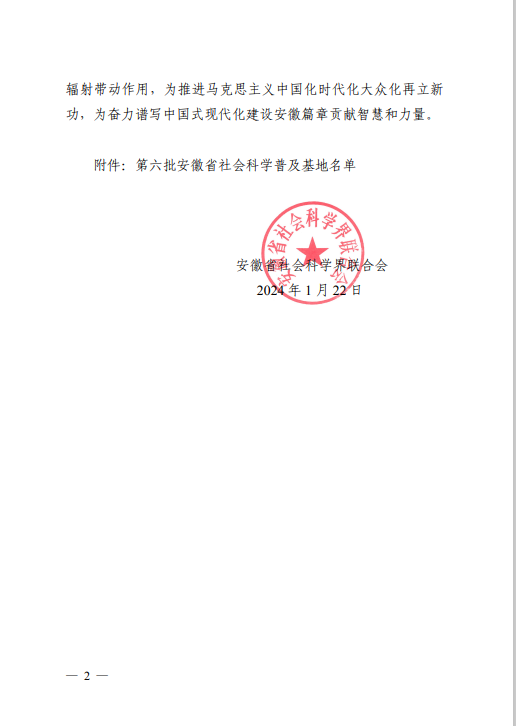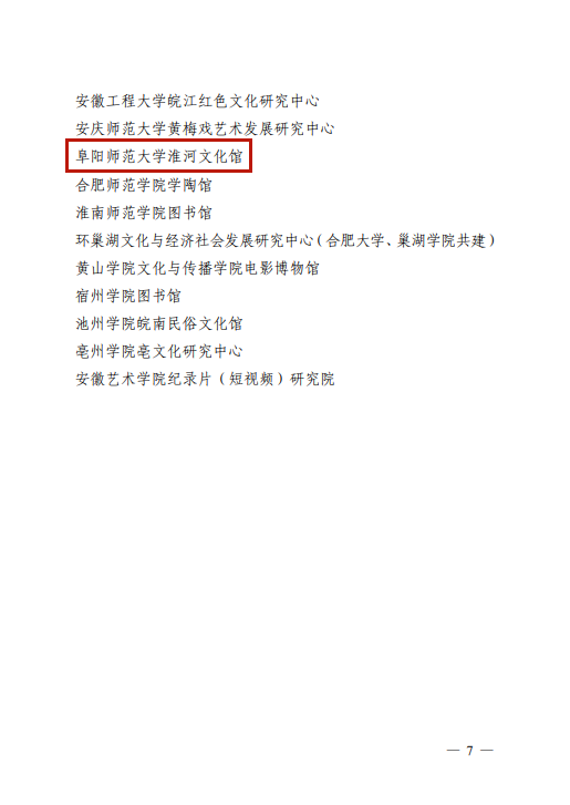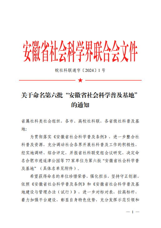 近日,安徽省社会科学界联合会下发《关于命名第六批“安徽省社会科学普及基地”的通知》,决定命名77家单位为第六批“安徽省社会科学普及基地”,我校淮河文化馆名列其中。