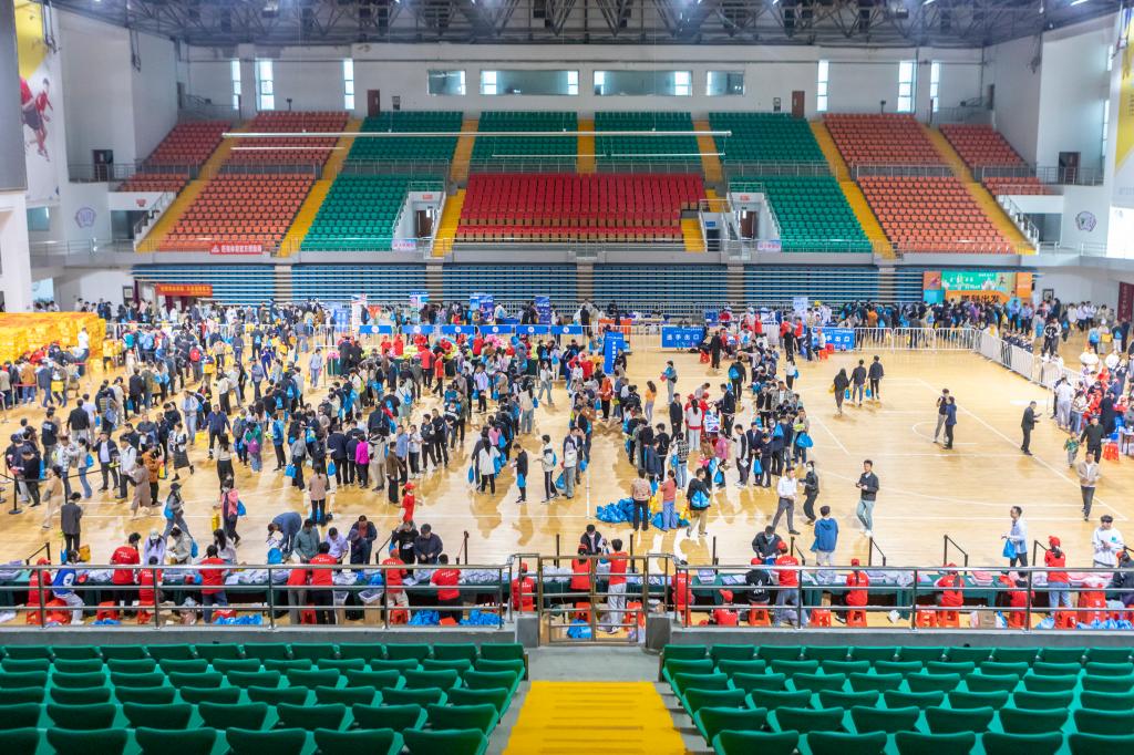 经过一天的紧张工作,我校120名志愿者,将一万余个参赛包全部装配完毕。4月19日和20日两天,大批跑友们前往阜阳师范大学西湖校区体育中心体育馆,在志愿者们的帮助下顺利领取参赛包。
