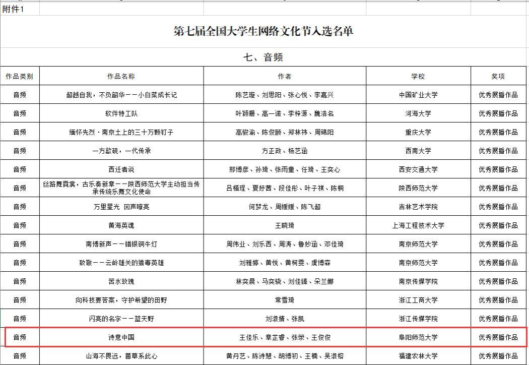 近日,由教育部思想政治工作司、中央网信办网络社会工作局联合举办的第七届“全国大学生网络文化节”和“全国高校网络教育优秀作品推选展示活动”入选名单公布,我校大学生记者团广播站王佳乐、章芷睿、张滎、王俊俊的音频作品《诗意中国》喜获音频类作品优秀展播作品奖(全国二等奖)。