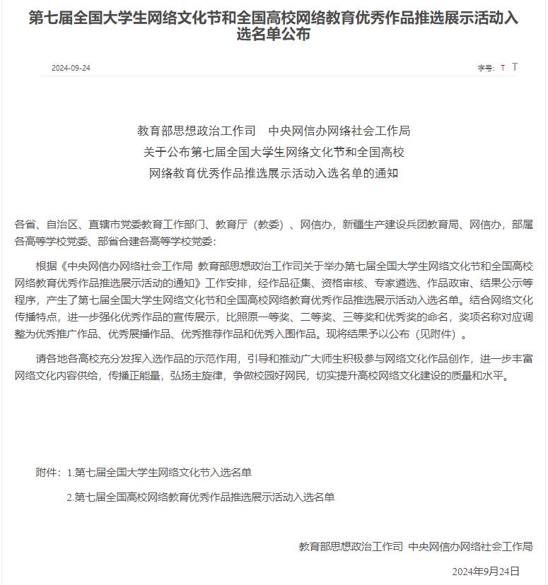 据悉,第七届“全国大学生网络文化节” 和“全国高校网络教育优秀作品推选展示活动”自2023年9月开展以来,通过省级教育工作部门推荐、教育部直属高校及部省合建高校推荐、个人(团队)自荐三种渠道,共征集到来自32个省(区、市)和新疆生产建设兵团的1621件作品。作为全国高校网络思政领域最高级别竞赛之一,本届网络文化作品评选以习近平新时代中国特色社会主义思想为指导,围绕“奋进新征程,建功新时代”主旋律,突出爱党爱国爱社会主义引领,推动广大师生积极参与网络文化作品创作生产,扩大高校网络文化影响力,不断强化守正创新,增强新时代高校思想政治工作的吸引力和实效性。
