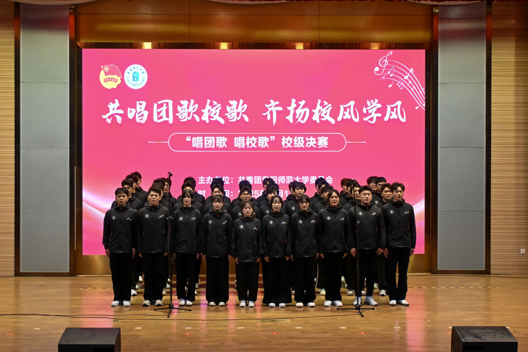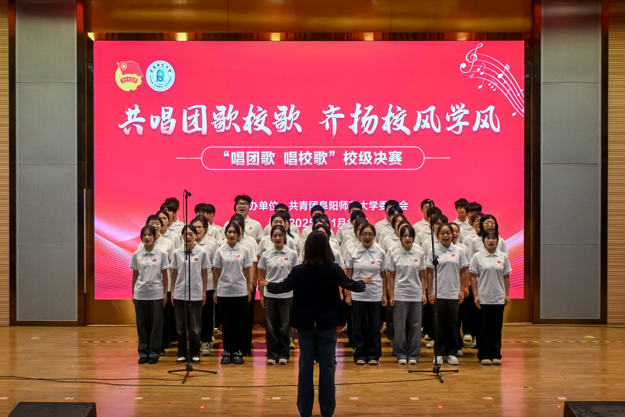 比赛中,全校各学院的17支参赛队伍紧紧围绕“共唱团歌校歌齐扬校风学风”主题依次登台。中国共产主义青年团团歌《光荣啊!中国共青团》的旋律激昂响起,学子们精神饱满、歌声铿锵,唱出了共青团员的责任与担当,展现出新时代青年紧跟党走、奋勇争先的昂扬风貌;当《阜阳师范大学校歌》的熟悉旋律回荡全场,同学们以深情的演绎,表达对母校的热爱,用真挚的情感传递对校风学风的认同与传承。各参赛队伍将青春活力与集体荣誉感融入每一句歌声,让经典曲目焕发出新时代的青春光彩。现场掌声此起彼伏,氛围既热烈又庄重。比赛中,大学生艺术中心带来了精彩纷呈的节目表演。器乐组一曲《兰亭序》曲韵悠扬,勾勒出东方美学的诗意画卷;语言组的深情朗诵《相机上的红丝绳》,以质朴之声将一份家国情怀娓娓道来;合唱团以一曲《如愿》将情感升华,动人的旋律与真挚的歌声交织,唱响了青春的理想与时代的和声,为激烈的赛事注入了温润而深厚的情感力量。经过激烈角逐,音乐舞蹈学院、化学与材料工程学院获一等奖。