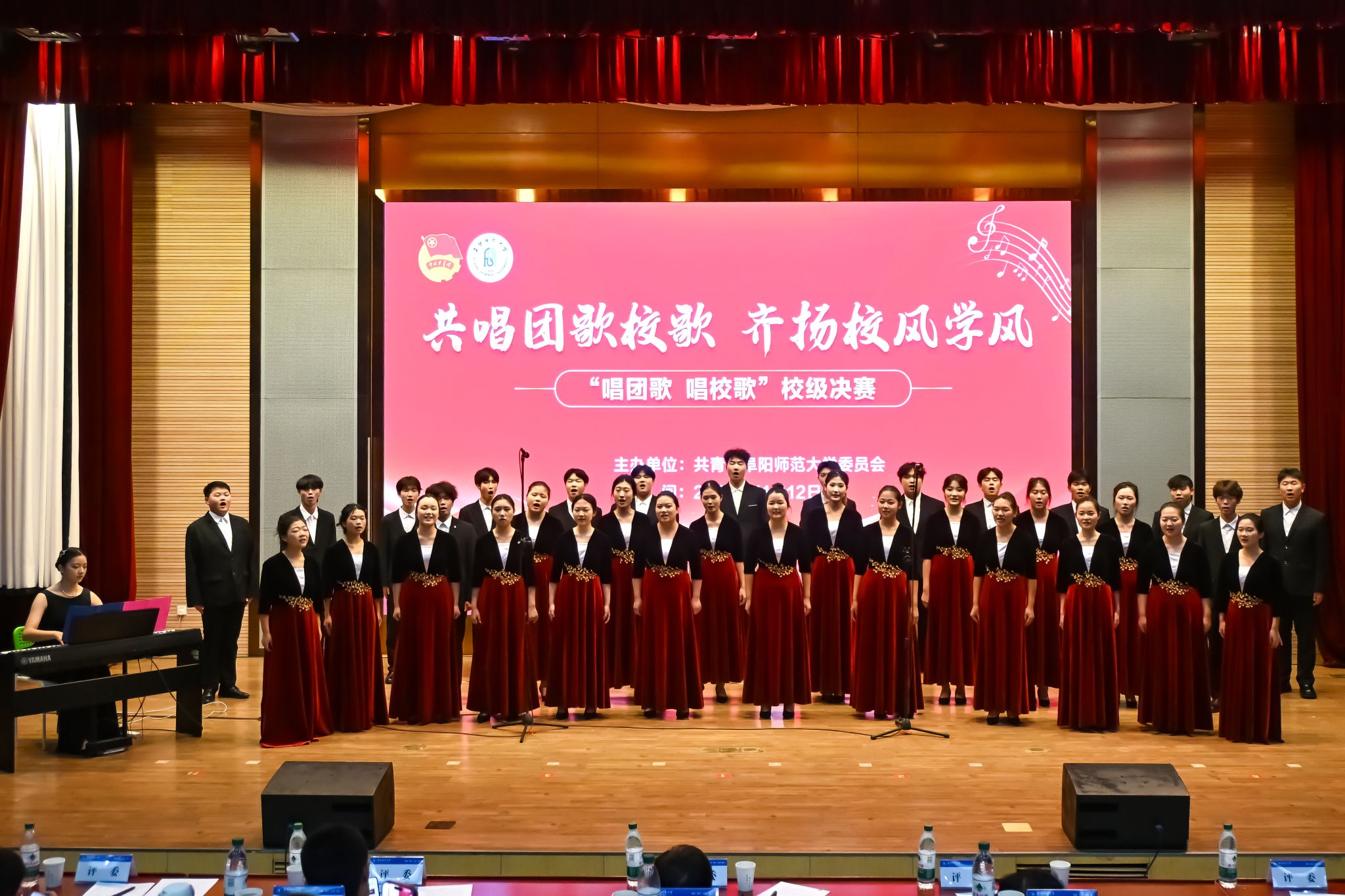 为深化青年学子的思想引领,厚植爱国爱校情怀,凝聚青春奋进力量,11月12日下午,我校在西湖校区正行楼二楼报告厅举办“共唱团歌校歌 齐扬学风校风”“唱团歌 唱校歌”校级决赛。阜阳团市委学少部部长丁晓龙、阜阳幼儿师范高等专科学校团委书记高天睿、阜阳市音乐家协会副秘书长杨宝文及我校音乐舞蹈学院副教授康红许、齐建立应邀担任评委。校党委常委、副校长黄云志出席比赛,党委宣传部、学生工作处、安全管理处、校团委等单位有关负责人观看比赛。