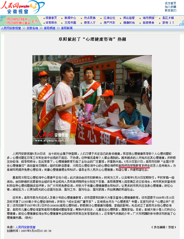 人民网:阜阳掀起了“心理健康咨询”热 2007-05-08
