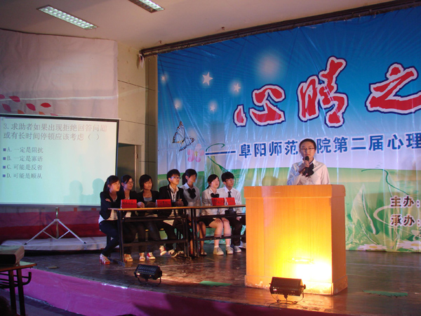 我校第二届心理健康知识竞赛圆满落幕 发布人:admin 浏览: 发布日期:2012-05-25 5月24日晚,“心晴之约”——阜阳师范学院第二届心理健康知识竞赛决赛在西湖校区举行。本次竞赛由学生处心理...【点击详情】