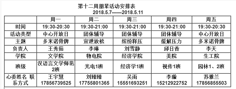 2017-2018学年第二学期第十二周朋辈活动安排表 2018-05-07
