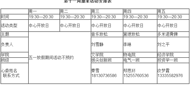 发布人:admin 浏览: 发布日期:2018-05-02 第十一周朋辈活动安排表 【点击详情】