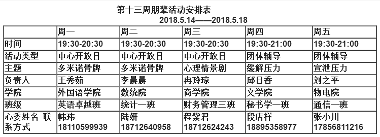 2017-2018学年第十三周朋辈活动安排表 2018-05-14