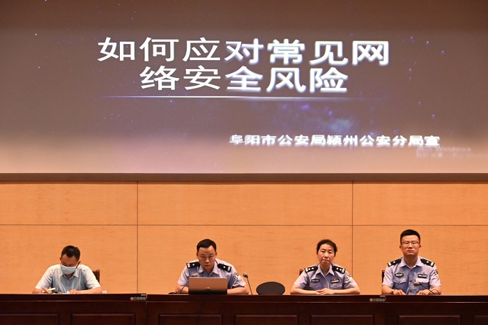 颍西派出所副所长王枫警官以“如何应对常见网络安全风险”为题,结合大量的网络安全案例,向与会同志介绍了网络安全的常见类型、存在风险及防范常识。