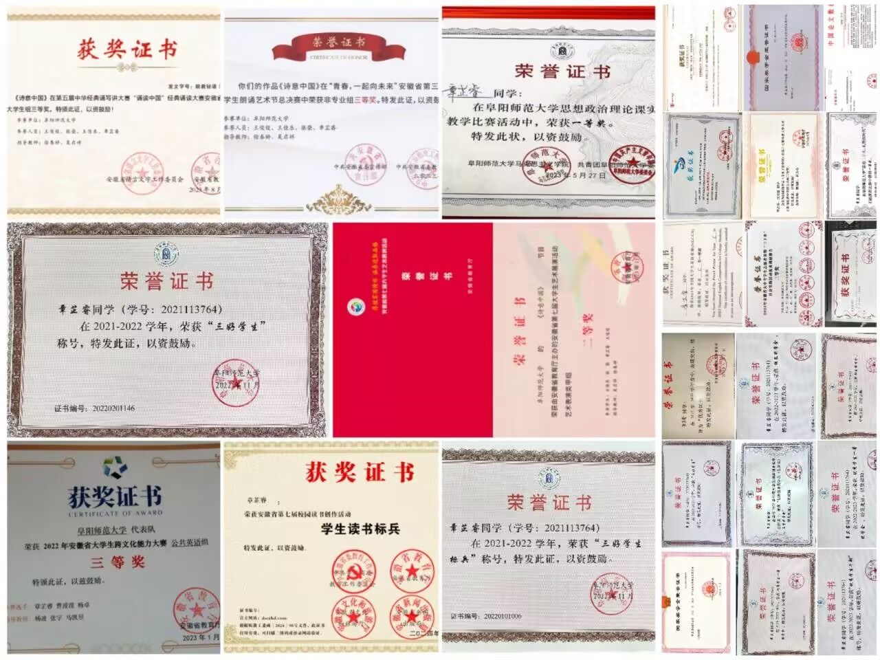 在校期间,曾担任班级思政委员、文学院汉语言文学专业学生第二党支部宣传委员、党务助理;获国家奖学金2次、校长奖学金3次、优秀学生一等奖学金3次;获“三好学生”、“优秀学生干部”、“三好学生标兵”等荣誉称号;在第十届“田家炳杯”全国师范院校师范生教学技能竞赛中荣获二等奖,在2024年安徽省师范生教学技能竞赛中荣获二等奖,在2023年全国大学生英语竞赛中荣获一等奖,在第八届中国国际“互联网+”大学生创新创业大赛中荣获省级铜奖,在安徽省第七届大学生艺术展演大赛中荣获二等奖;发表学术论文1篇。