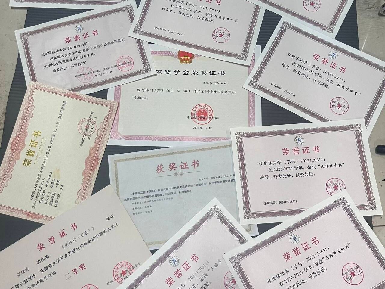 在校期间,曾担任班级学习委员、纪律委员;获国家奖学金、校长奖学金、优秀学生一等奖学金等;获“三好学生标兵”、“三好学生”、“优秀团员”等荣誉称号;在第六届中华经典诵写讲大赛“笔墨中国”汉字书写大赛安徽省预选赛毛笔组中获省级三等奖,在安徽省大学生书法篆刻专项展示活动阜阳师范大学校内选拔赛中获特等奖,在安徽省大学生书法篆刻专项展示活动中获省级二等奖。
