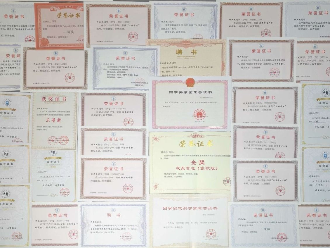 在校期间,获国家奖学金、国家励志奖学金、校长奖学金、优秀学生一等奖学金、优秀学生二等奖学金、创新创业二等奖学金、创新创业三等奖学金等;获“三好学生标兵”、“三好学生”、“优秀学生干部”、“诚信自强之星”、“教学信息中心先进个人”、“文体优秀奖”等荣誉称号。