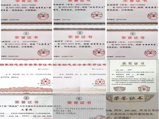 在校期间,获国家励志奖学金2次、校长奖学金2次、优秀学生一等奖学金2次、三等奖学金1次、自胜奖学金1次等;获“三好学生”、“阜阳师范大学优秀实习生”等荣誉称号;在2023年全国大学生英语竞赛C类获一等奖。
