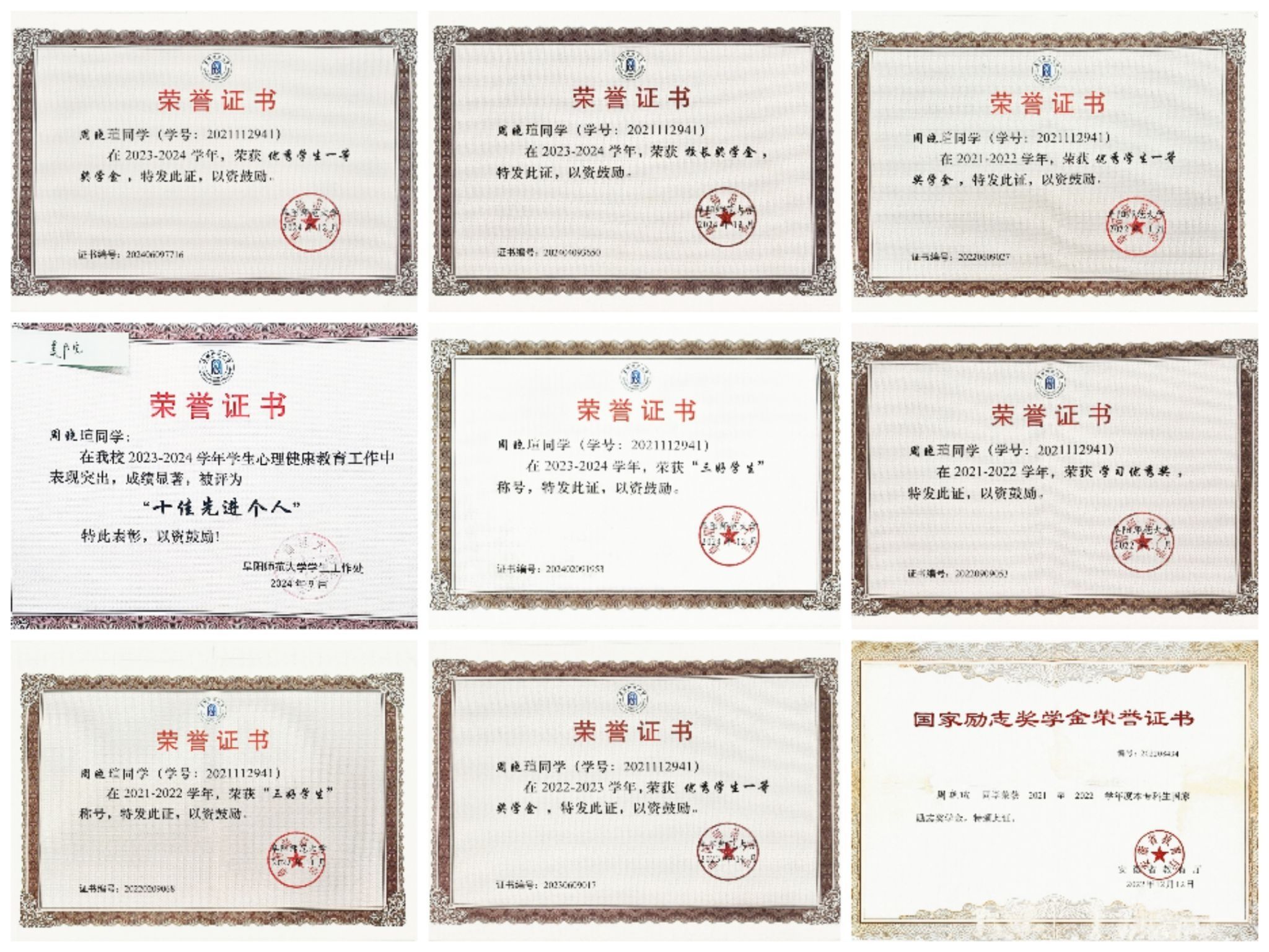 在校期间,曾担任班级团支书、美术学院心理委员联合会执行主席、2023级新生辅导员助理;获国家奖学金、国家励志奖学金、校长奖学金、优秀学生一等奖学金等;获“三好学生”、“三好学生标兵”、“优秀团干部”、“阜阳师范大学十佳先进个人”等荣誉称号。