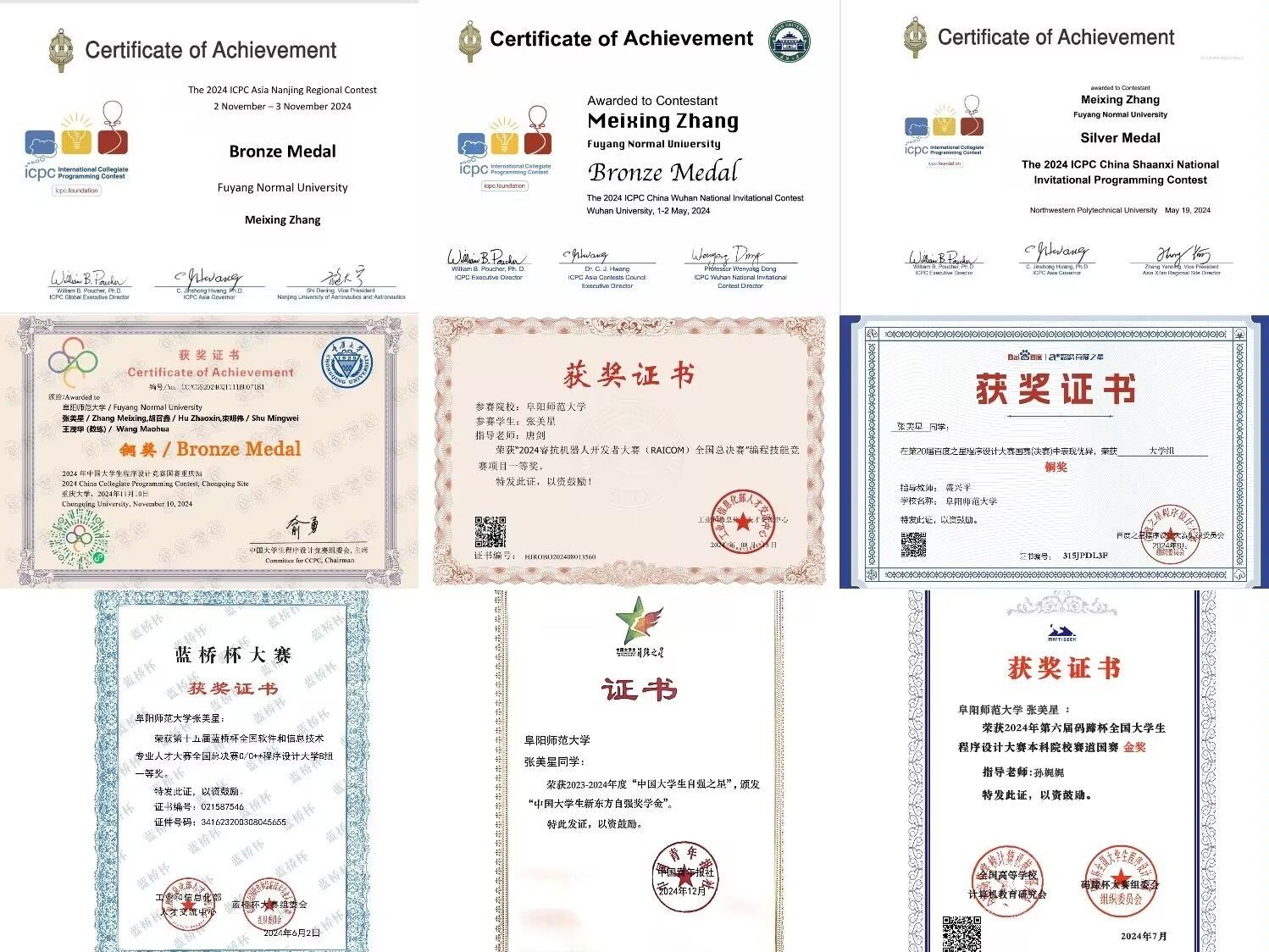 “代码的世界充满无限可能,每一个字符都蕴含着创造的力量。”张美星自高中毕业起便对计算机编程产生了浓厚的兴趣,进入大学后,他毫不犹豫地加入了ACM实验室,开启了他在代码海洋中的探索之旅。在各类编程活动中,他如饥似渴地学习各种编程语言和算法知识,从简单的C语言程序设计,到复杂的算法竞赛题目,他都深耕学习、逐一攻克。通过不懈努力,荣获第十五届蓝桥杯全国软件与信息技术专业人才大赛全国总决赛一等奖、RoBoCom机器人开发者大赛 全国决赛一等奖、ICPC国际大学生程序设计大赛全国邀请赛(西安站)银奖、ICPC国际大学生程序设计大赛亚洲区域赛(南京站)铜奖、CCPC中国大学生程序设计大赛区域赛(重庆站)铜奖等多个学科竞赛奖项。