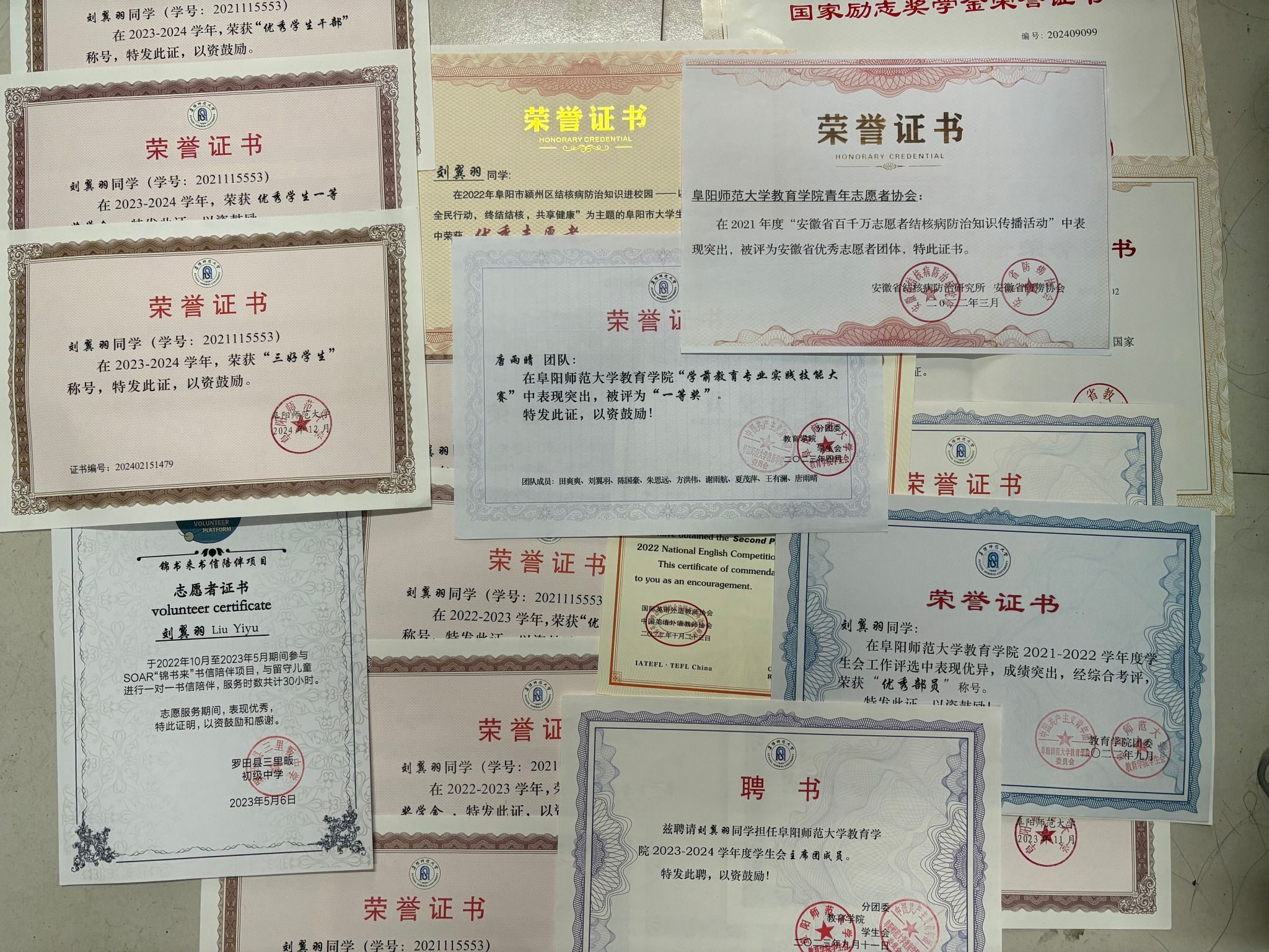 在校期间,曾担任教育学院青年志愿者协会会长、班级文艺委员;获国家励志奖学金、自胜奖学金、校长奖学金、优秀学生一等奖学金等;获“三好学生标兵”、“ 三好学生”、“ 优秀学生干部”、“ 优秀团员”等荣誉称号。