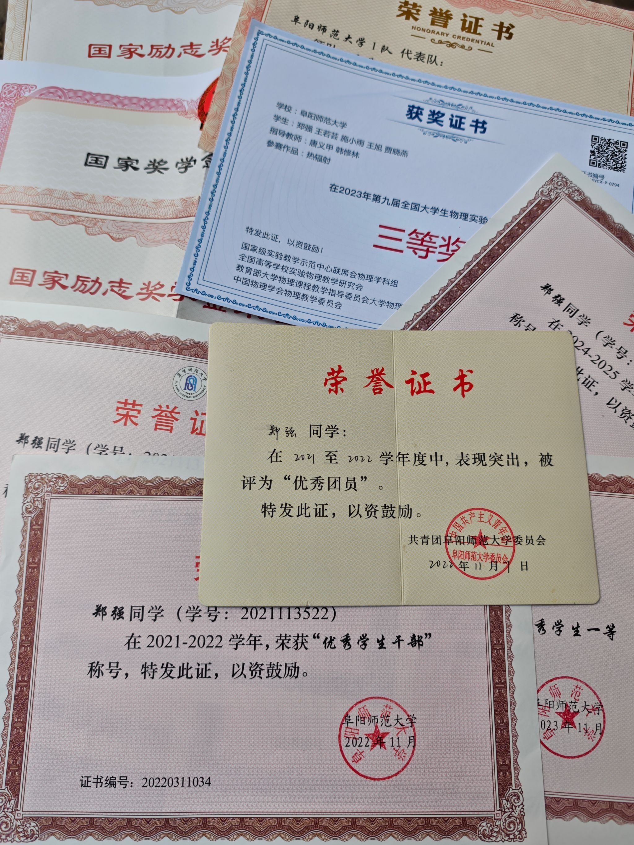 在校期间,获国家奖学金、国家励志奖学金、校长奖学金、自胜奖学金、优秀学生一等奖学金;获“安徽省高等学校优秀毕业生”、“ 校优秀毕业生”、“ 三好学生标兵”、“ 三好学生”、“ 优秀学生干部”、“ 优秀团员”等荣誉称号;在第九届全国大学生物理实验竞赛中获国家级三等奖,在安徽省大学生物理学术竞赛中获省级二等奖等。