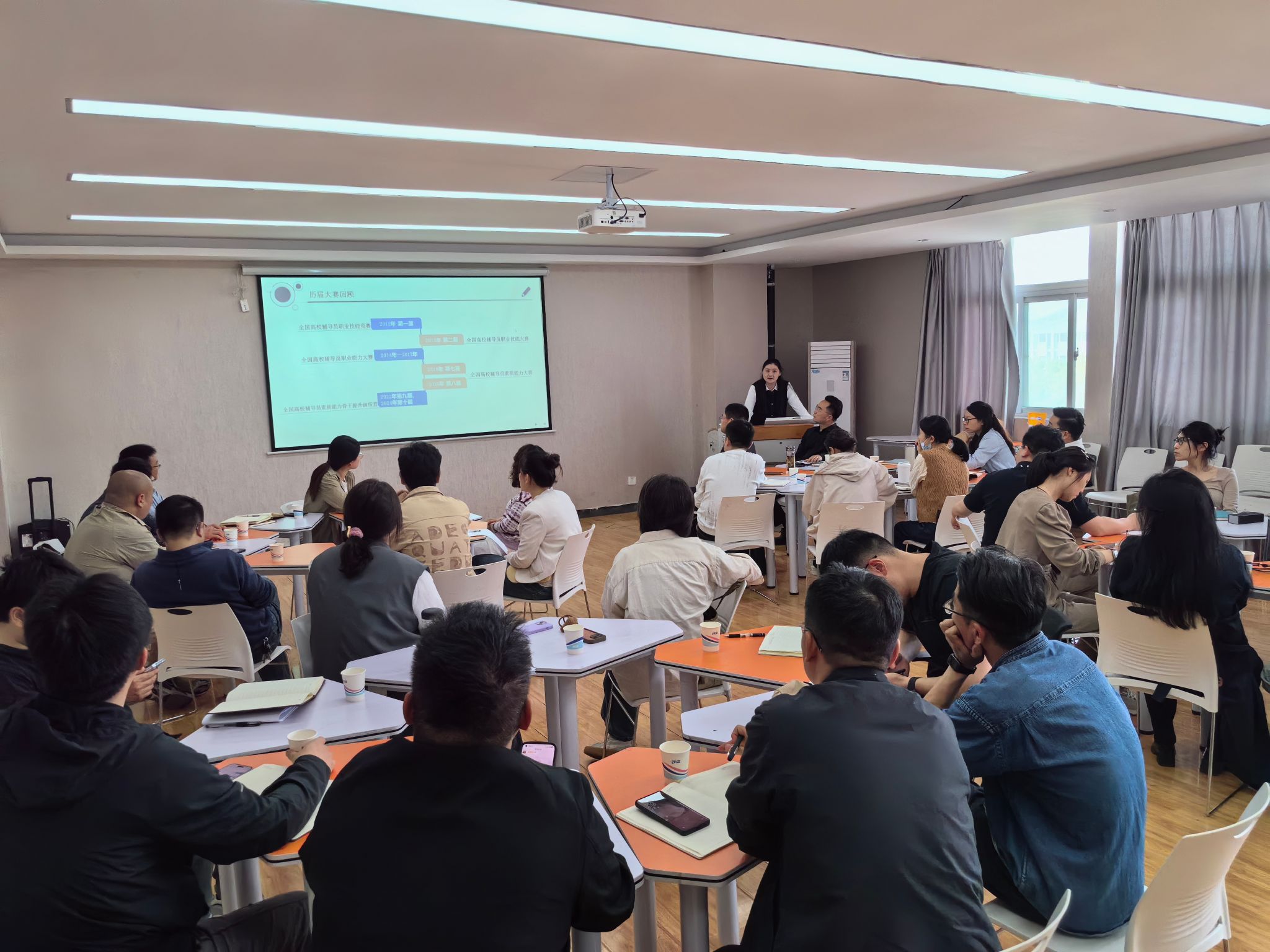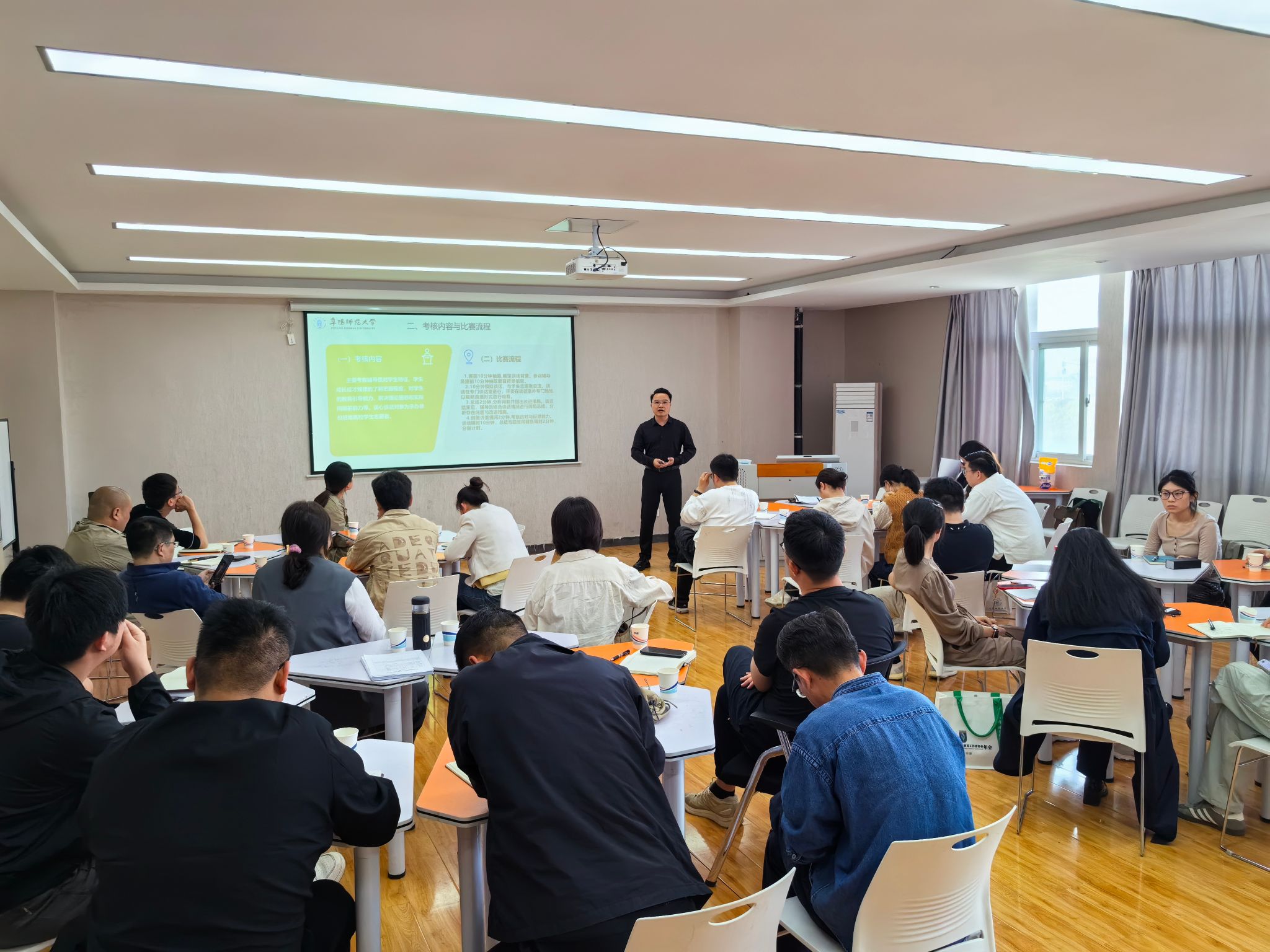 活动分主题汇报和实战演练两个阶段进行。在主题汇报环节,数学与统计学院党委副书记徐悦、马克思主义学院党委副书记徐朝东、专职辅导员孟当当、张桃、张翰文等五人,结合外出培训所学与工作实际,依次围绕赛制演变、学情分析、基础知识测试、案例研讨、谈心谈话等内容详细解读了新赛制背景下辅导员素质能力大赛的考察要点与备赛策略。