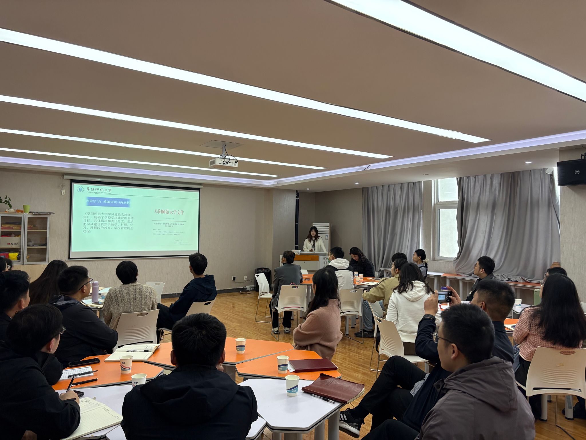 “五育堂”辅导员名师工作室首席专家、生物与食品工程学院专职辅导员熊阳阳领学了《关于进一步弘扬科学家精神加强作风和学风建设的意见》及《阜阳师范大学学风建设实施细则》等文件精神,并结合工作室实际,详细分享了“五育堂”辅导员工作室的建设理念与运行机制,重点阐释了“五育融合”育人模式下学风建设与班风塑造的系统路径。