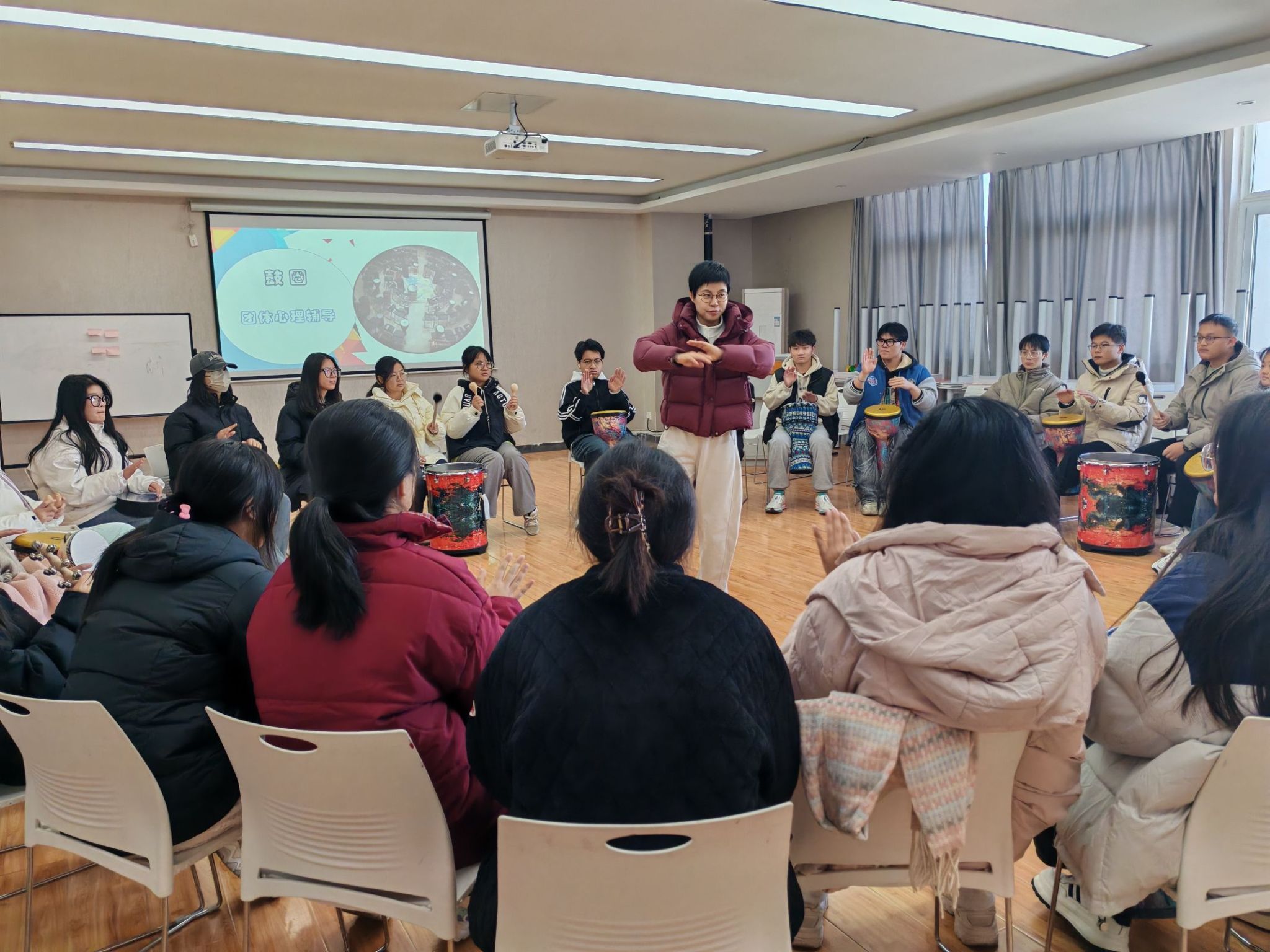 面对情感丰富、思维活跃的美术生,李阳敏锐意识到传统说教效果有限。她果断转变思路,系统学习艺术治疗理论,实现从“事务管理者”到“心灵成长伙伴”的角色升华。她将色彩、节奏、形体转化为沟通语言,通过“五感疗愈”校园漫步、“双人绘画”信任搭建、“鼓圈疗愈”矛盾化解等创新形式,打破师生间的隐形壁垒。她常说:“语言易成屏障,色彩与节奏方为通码。”这种以艺术为媒介的深度共情,让思政工作真正走进了学生心里,也为后续的系统化育人实践奠定了坚实基础。