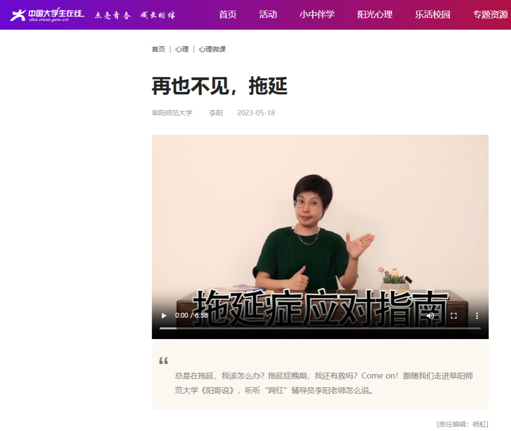 李阳坚信,思想引领必须贴近学生、打动人心。她充分发挥美术专业优势,用艺术语言重构思政话语,让价值引领可知可感、入脑入心。在价值引领中,她带领学生创作70余部红色情景剧,自编自导自演20余部短视频,用“小剧情”讲述“大道理”。参编的原创舞台剧《长江之子》获评教育部“读懂中国”优秀舞台剧,并立项2025年“科学大师宣传工程”重点项目。她引导学生用画笔服务社会,带领学生走进30余个乡村,绘制2万余平方米文化墙,在公益实践中厚植家国情怀。在心理育人中,她作为《大学生心理健康教育》课程改革核心成员,连续承担13轮教学任务,覆盖学生1800余人。她创编《阳哥说》心理微剧场、《疗心画坊》艺术疗愈微课,将课程打造为“有趣又有用”的公共金课。主创微课《一定要变得外向吗》入选教育部全国心理健康教育微课征集展示;短视频《再也不见,拖延》在中国大学生在线网站展播。她开展的30余场沉浸式艺术疗愈工作坊、21场示范课,成为学生心灵成长的“充电站”。