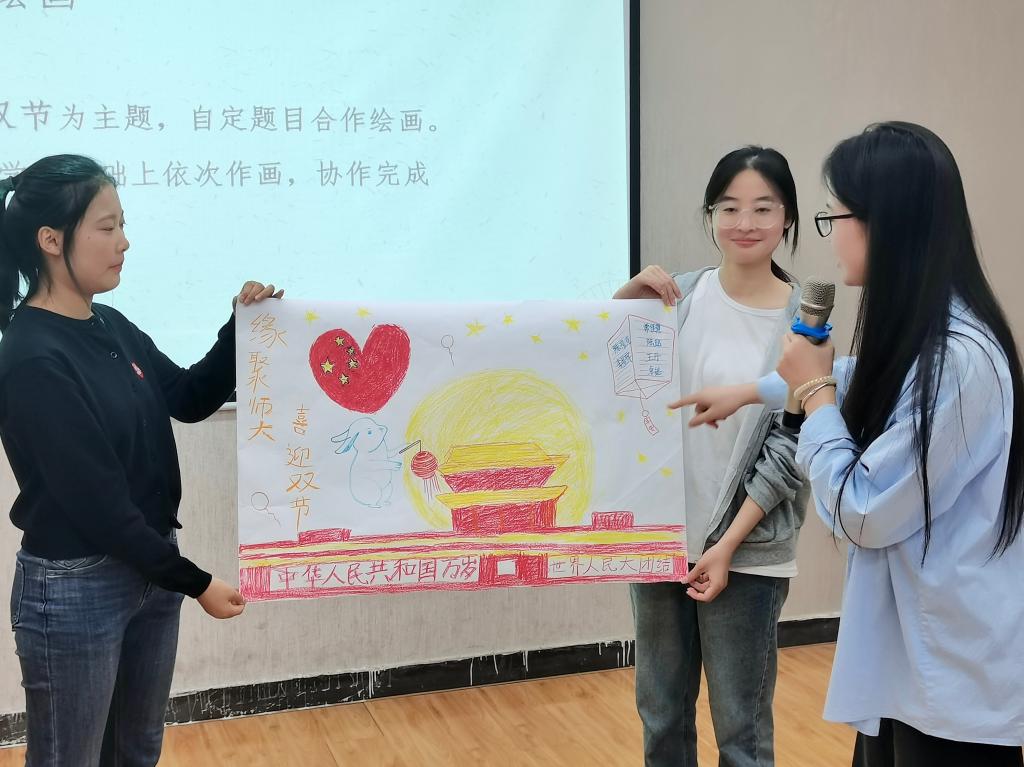 活动现场,师生们通过“个性化姓名串起来”破冰游戏消除了拘谨,拉进了距离。大家相互熟悉后,与会人员分小组开展了“团体合作绘画涂鸦”活动。一幅幅色彩丰富、寓意深刻的作品,绘出对党和祖国的深深热爱,画出对老师、家人和朋友的美好祝愿。在分享交流环节,与会人员纷纷表示,艺术疗愈对快节奏、高压力的生活是一种非常好的舒缓放松方式,大家在活动中品味到青春的美好、友谊的甘甜和家国平安、生活幸福的珍贵。