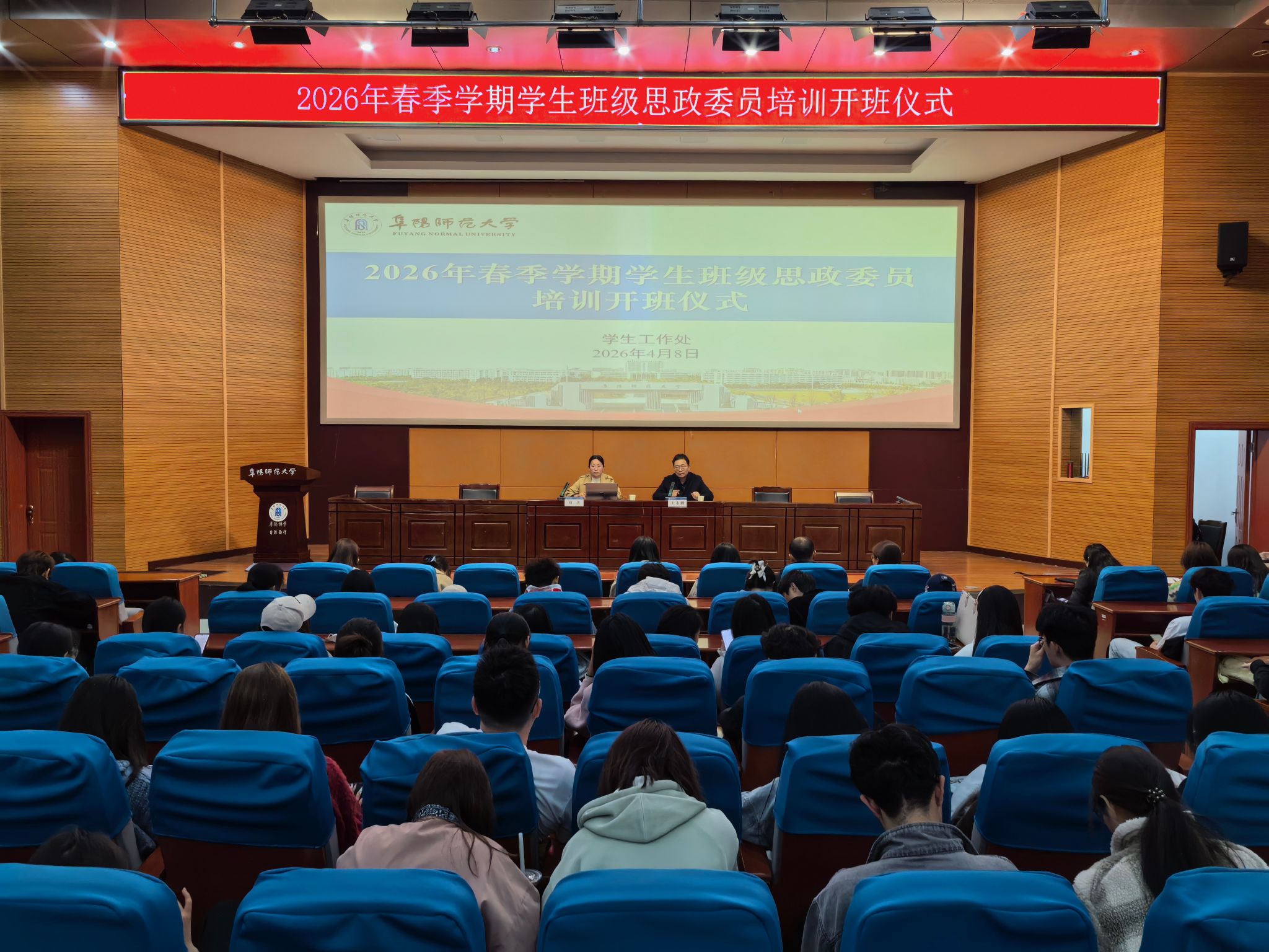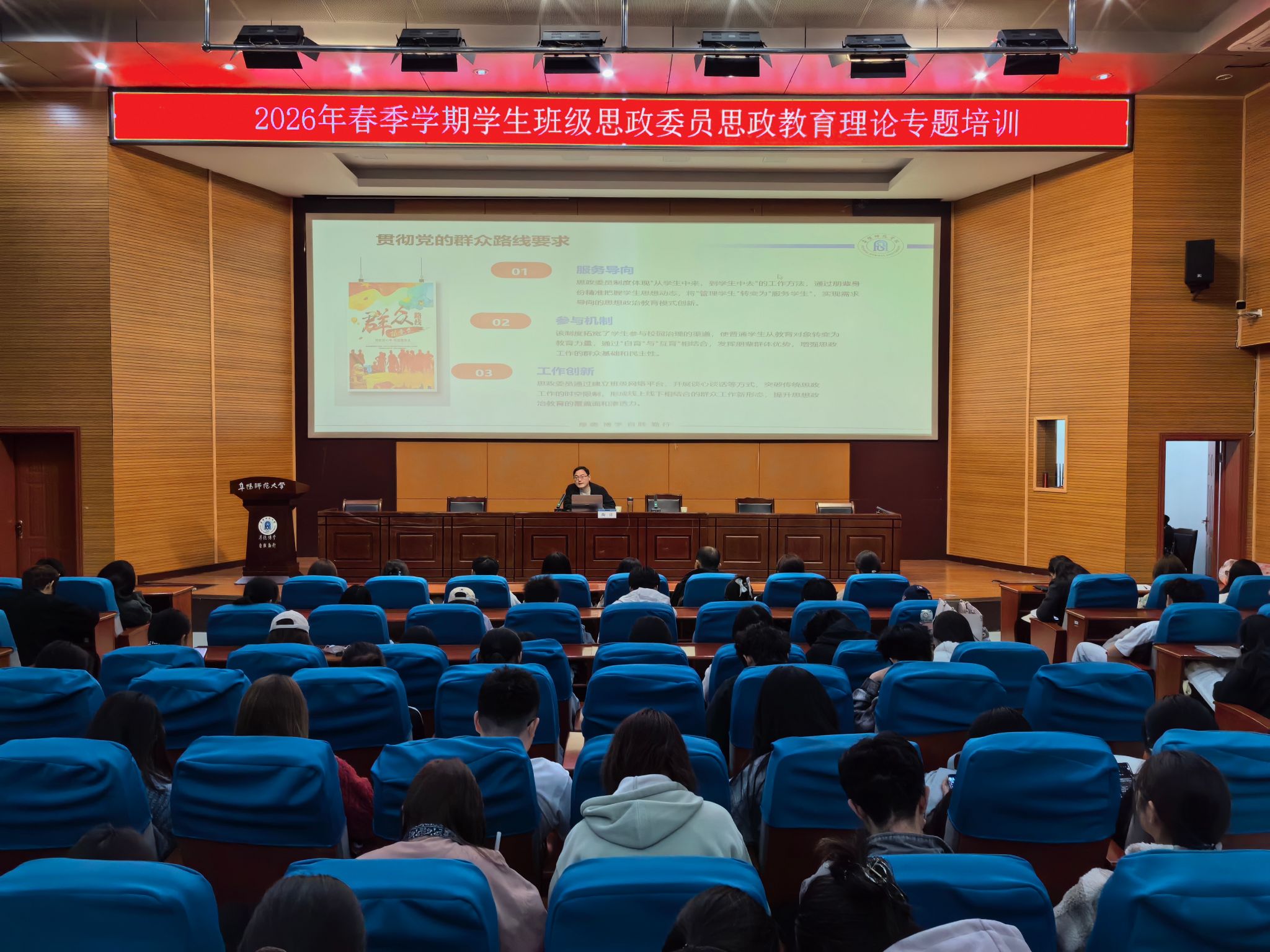 为强化我校学生班级思政委员队伍建设,充分发挥思政委员在思政育人中的纽带,在朋辈育人中的积极作用。4月8日,我校在西湖校区F楼报告厅举行2026年春季学期学生班级思政委员培训开班仪式。学生工作处(党委学工部、武装部)副处长王永刚、各学院辅导员代表及思政委员代表近三百人参加开班仪式。开班仪式由学生工作处思政教育科副科长、培训班班主任刘洪主持。