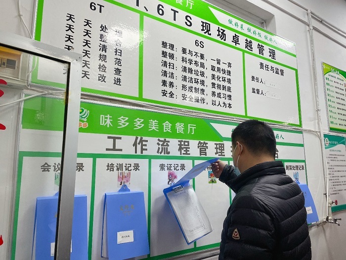 师生先后参观了清河校区味多多美食餐厅的操作间、主副食库、原料库、售卖间及餐具洗消间。参观过程中,负责人详细介绍了食堂原料采购、食品安全监测、安全生产、菜品留样、免费汤供应、菜品质量价格保障、各功能区环境卫生管理、明厨亮灶实施等方面情况,并认真地回答了师生现场提出的问题。